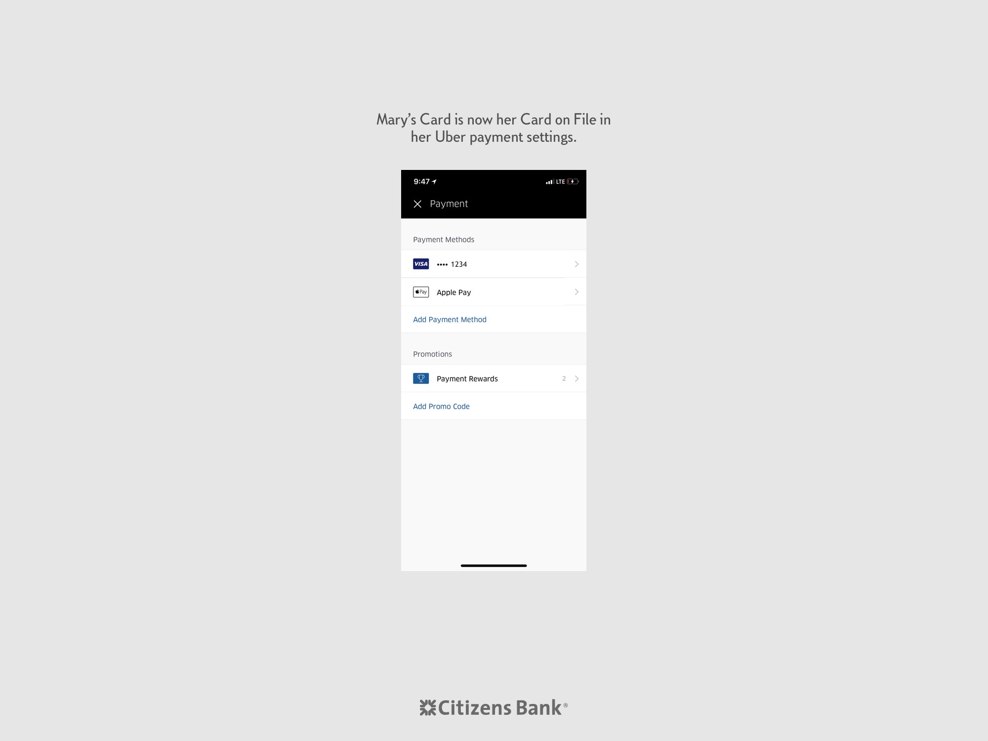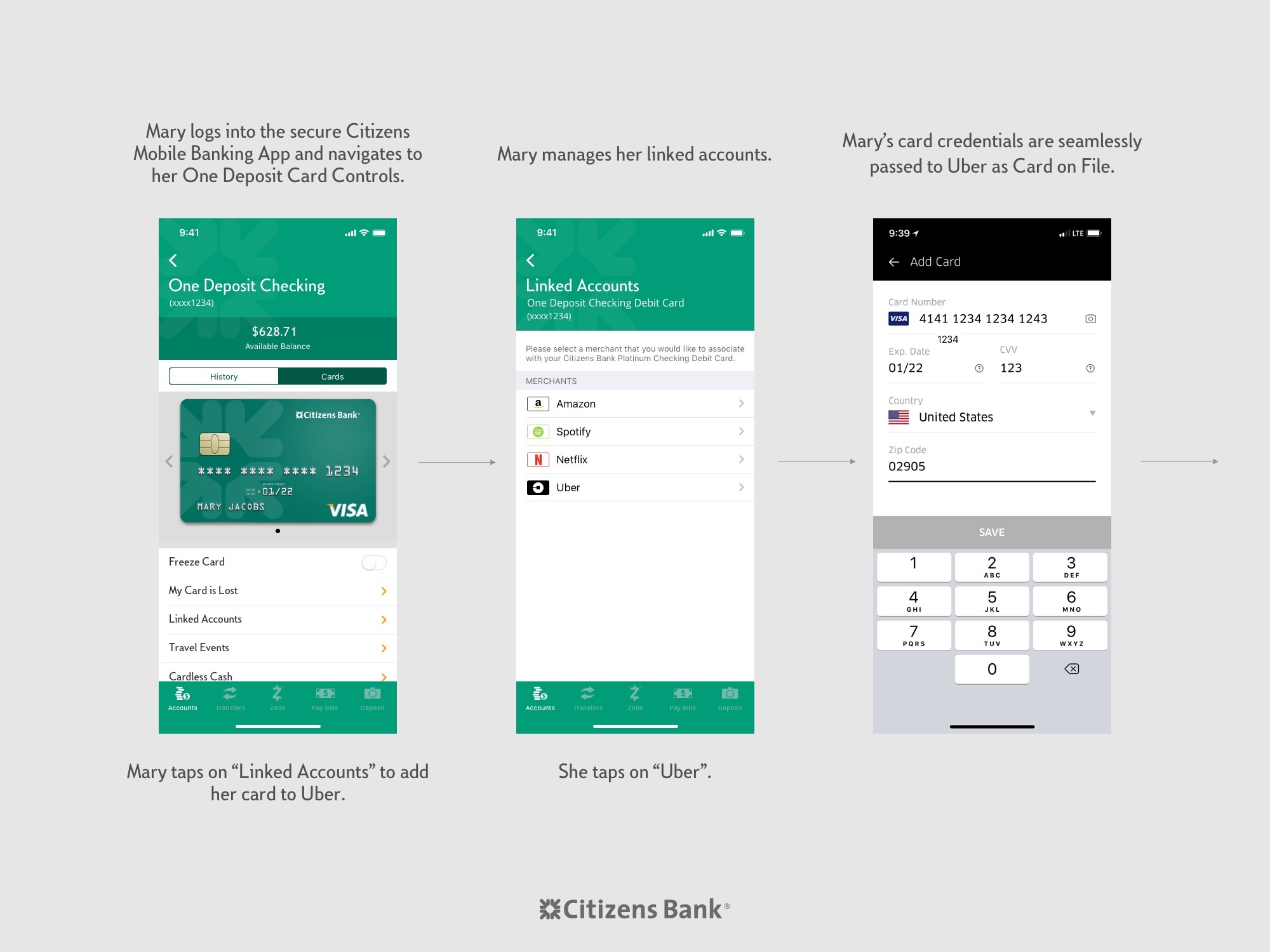 Next, Mary navigates from card controls into Linked Accounts and taps Uber from a list of the merchants she uses most. With her permission, her card credentials are seamlessly passed from Citizens to Uber as a card on file, and the Uber app immediately recognizes her new payment method without Mary ever having to type a card number into a third-party surface.