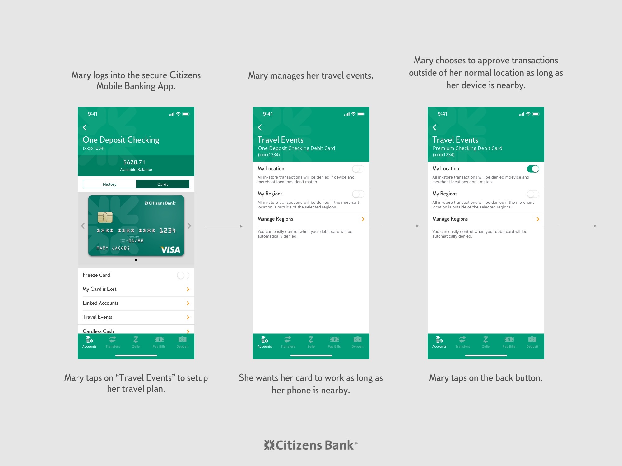 This is the first feature in the narrative that directly answers the pain point we established in part two. The travel notification problem that caused a loyal customer to get stranded on vacation is solved by a control that Mary configures herself, in under a minute, without needing to call the bank or speak to a representative.