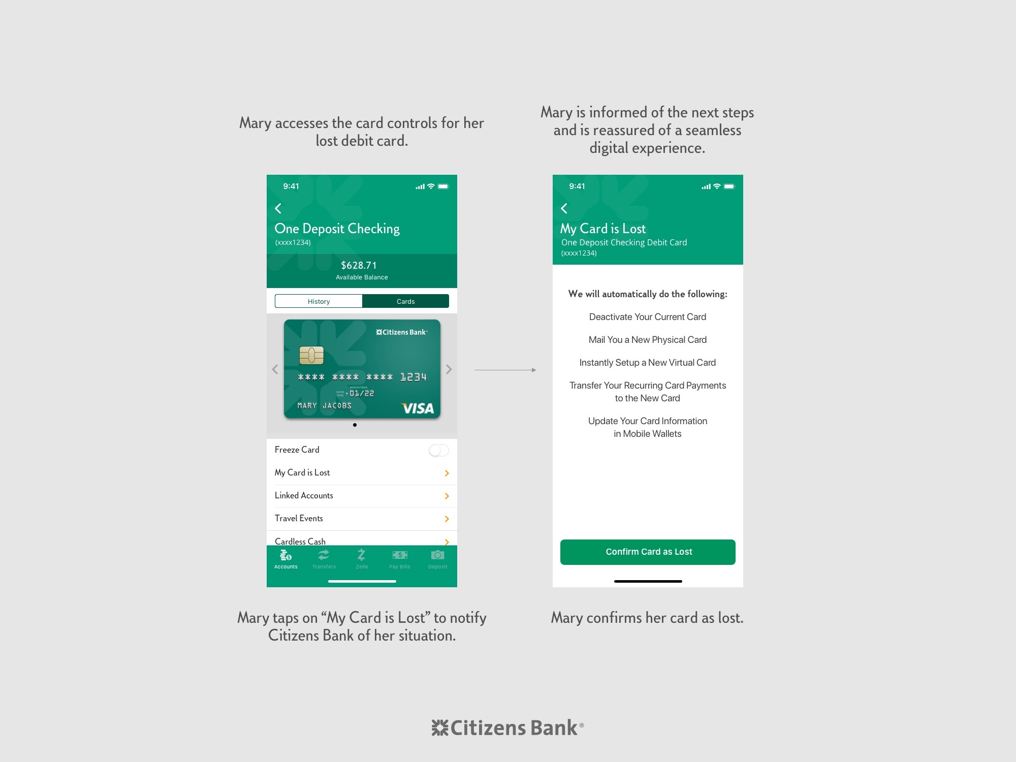 She opens the Citizens Mobile Banking app directly from the table, navigates into the card controls screen for her One Deposit Checking account, and taps My Card is Lost. The app confirms her situation, then walks her through exactly what will happen next. Citizens will deactivate her current card, mail her a new physical card, instantly set up a new virtual card, transfer her recurring card payments to the new card, and update her card information everywhere it is stored in her mobile wallets. Mary taps Confirm Card as Lost, and the entire flow is done.