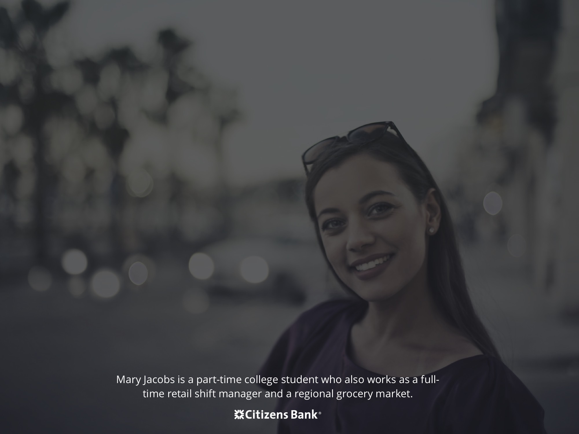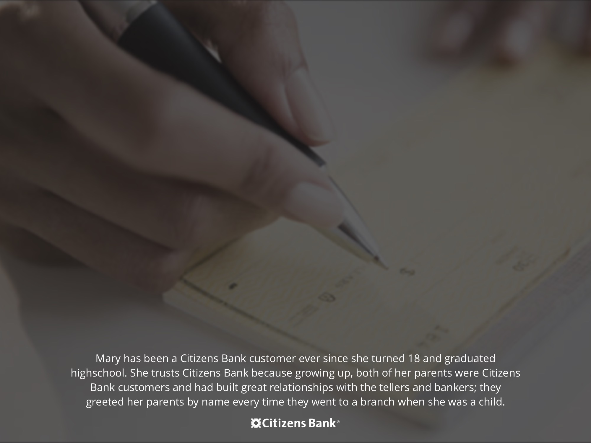 Mary has been a Citizens customer since the day she turned eighteen and graduated from high school. Her trust in the brand is inherited. Both of her parents banked with Citizens while she was growing up, and they had built real relationships with the tellers and bankers at their local branch. The staff greeted her parents by name every time the family walked through the door, and that memory is the reason Mary's very first checking account was with us.