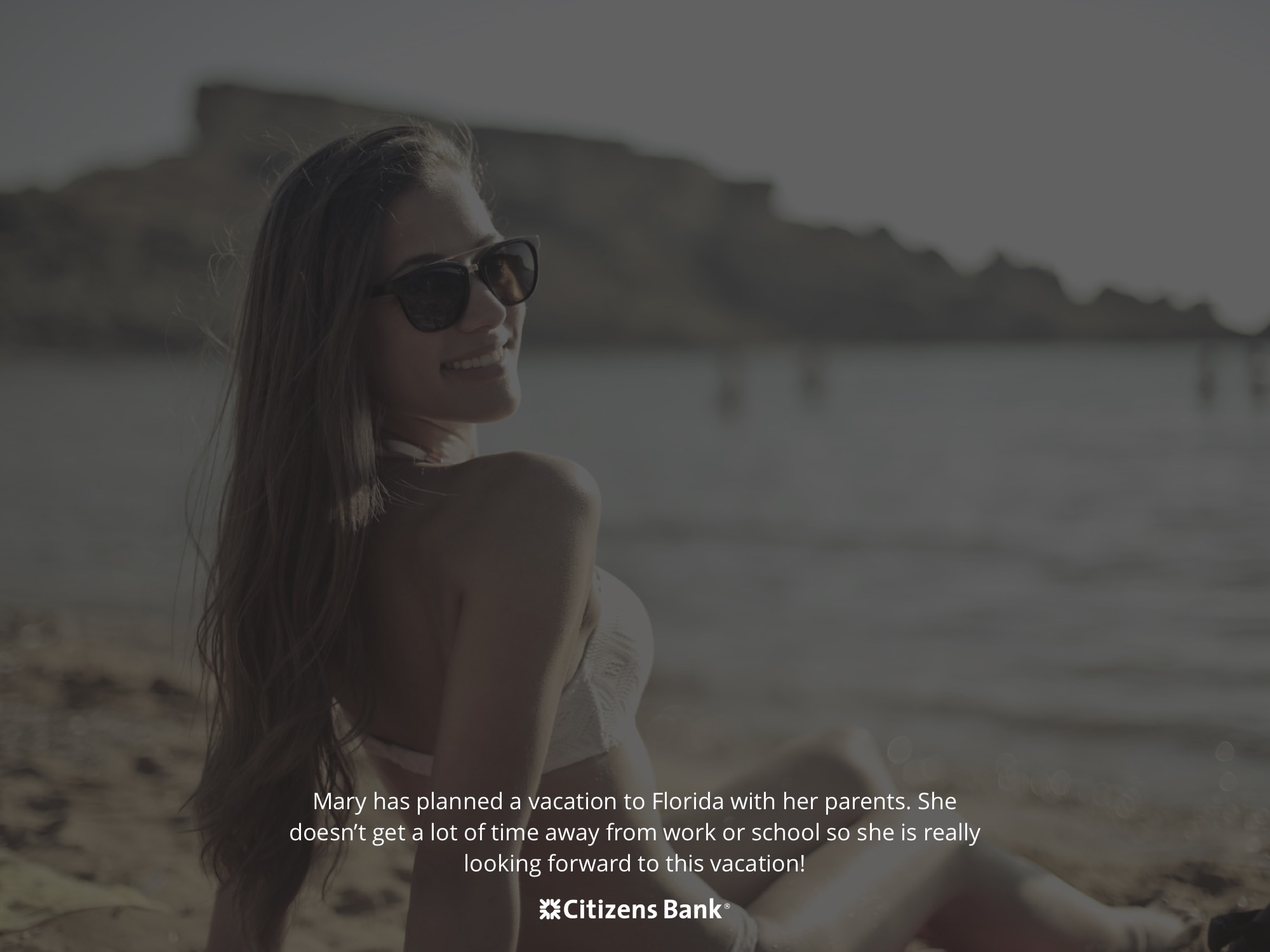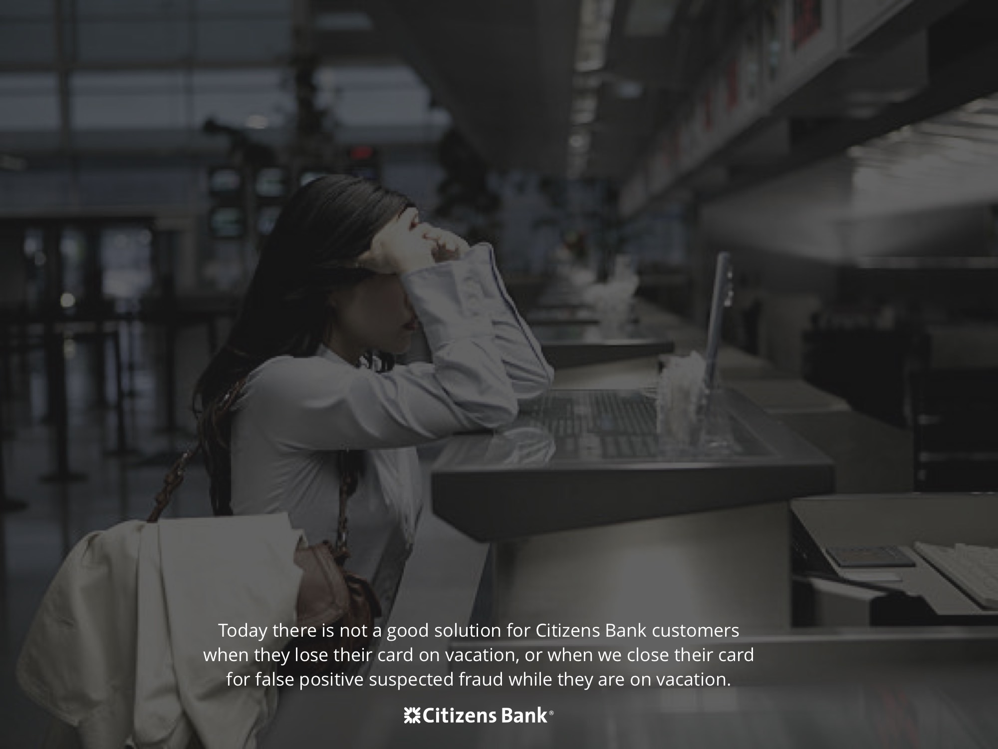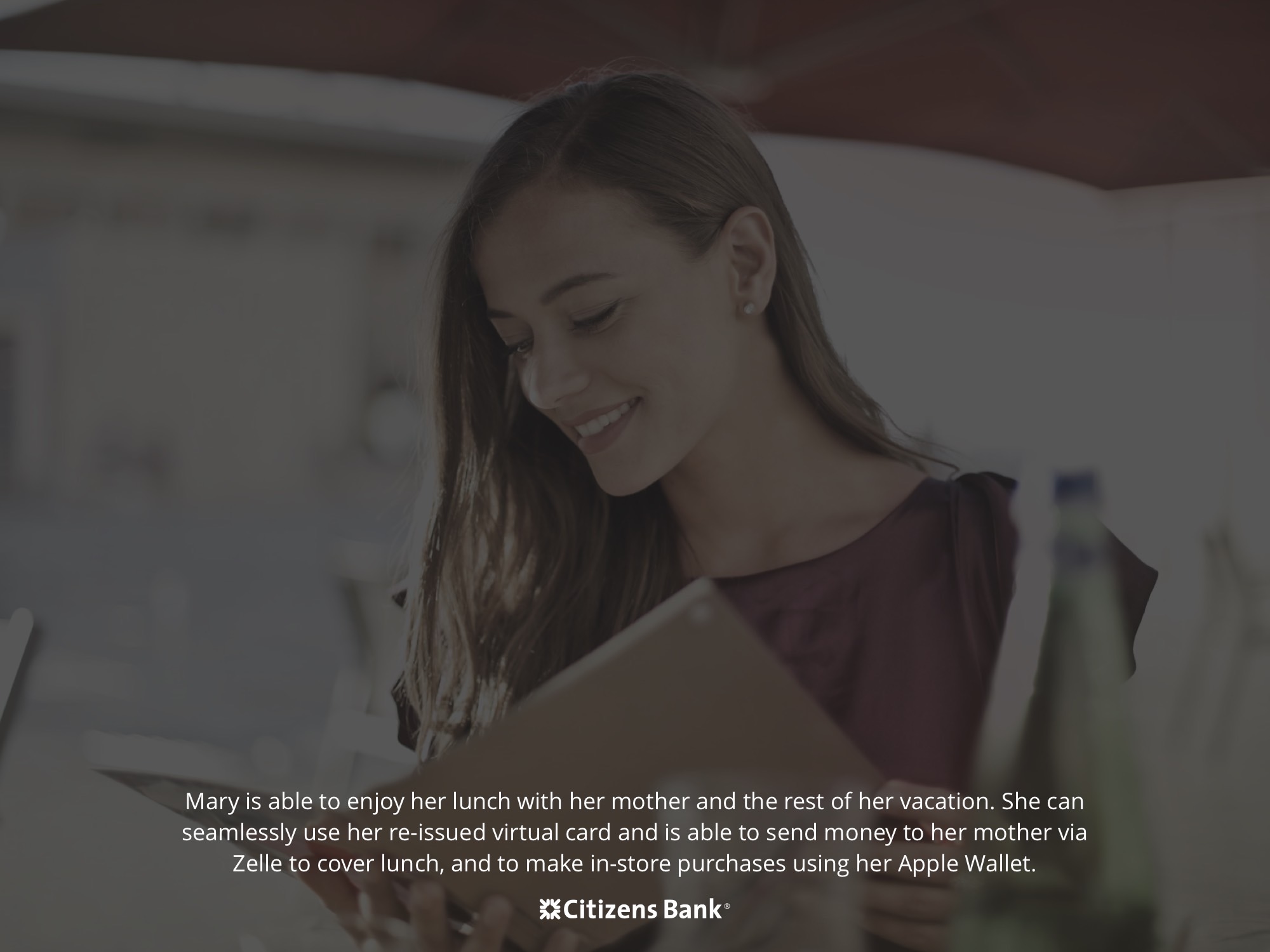 The physical card that Citizens mailed to her home address will be waiting for her when she gets back. It simply does not matter anymore, because the product has already filled the gap. This final image closed the narrative on exactly the emotional note the presentation had been building toward. A loyal customer, on a trip she had been looking forward to for months, experienced a real setback and walked away with her day intact because of the work this program was asking to fund.
