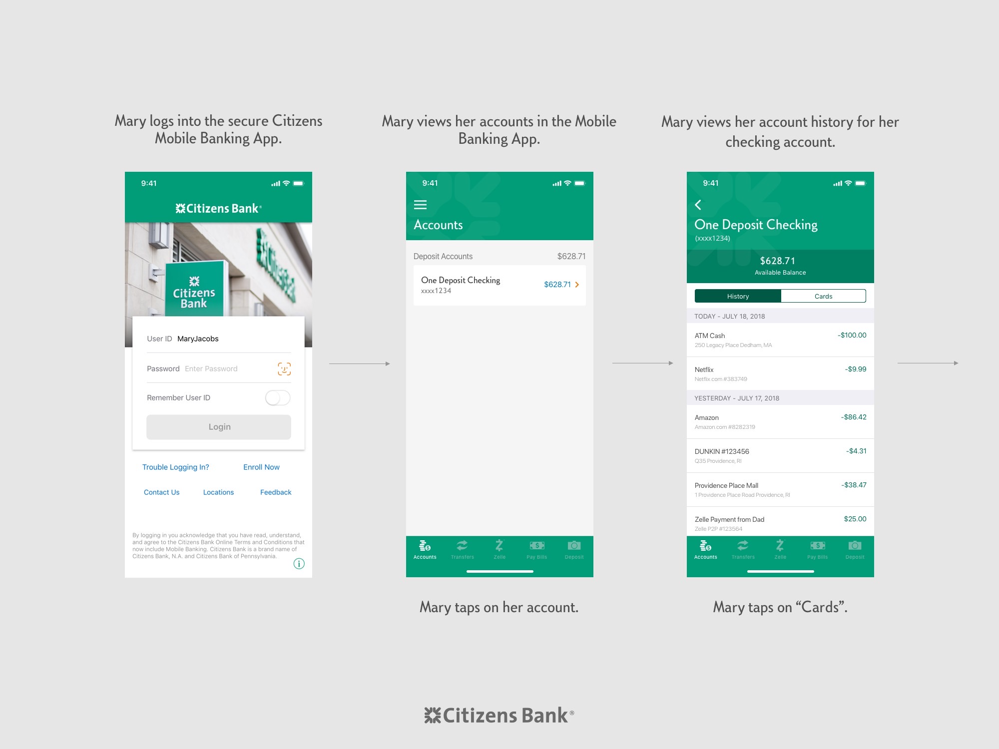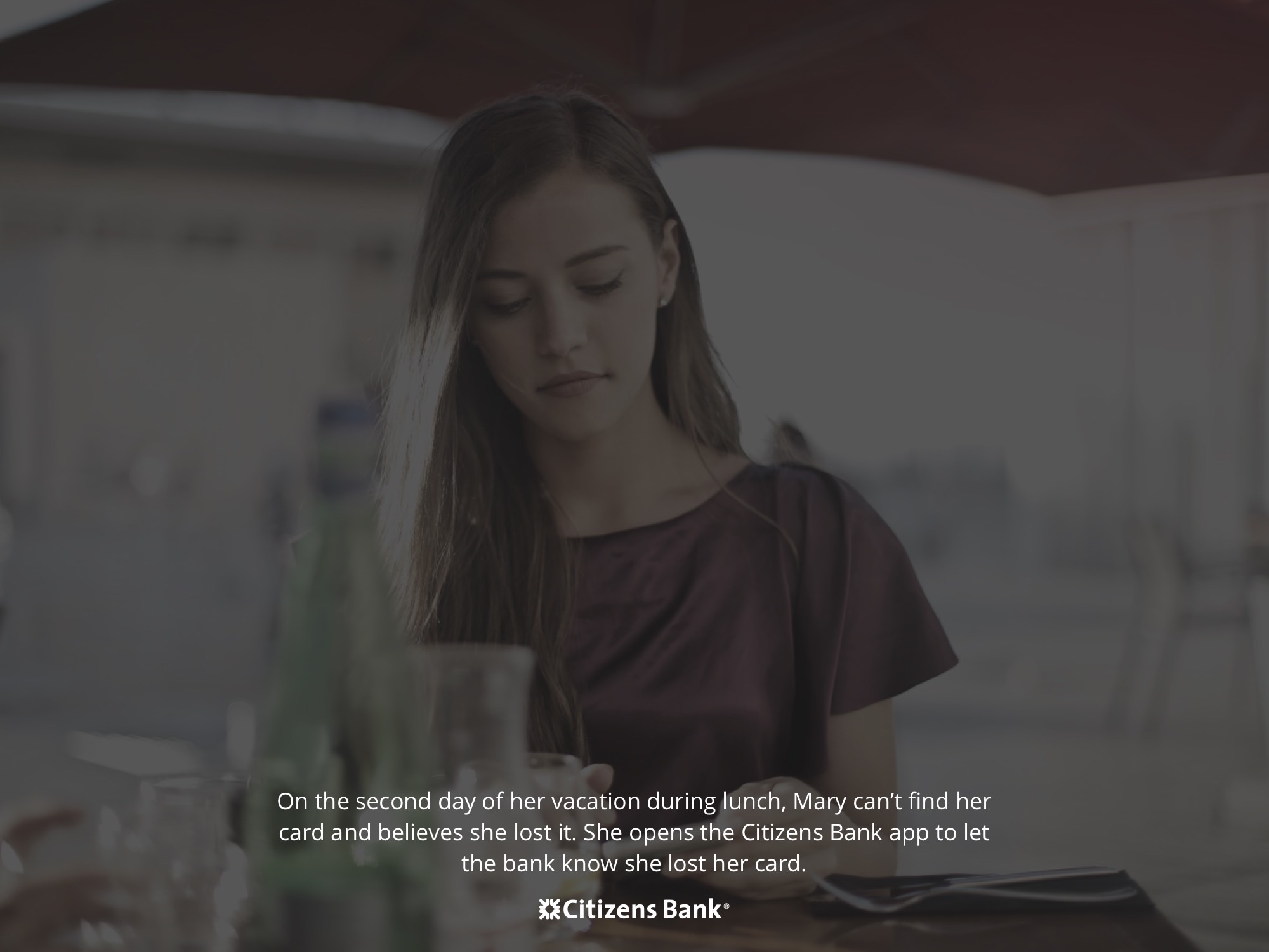 Before her trip, Mary logs into the secure Citizens Mobile Banking app, opens her One Deposit Checking account, reviews her recent activity, and navigates into the Cards section. None of this is new behavior for her. She is a customer who already checks her balance multiple times a week, and she expects to be able to reach anything she needs from the account screen in just a few taps.