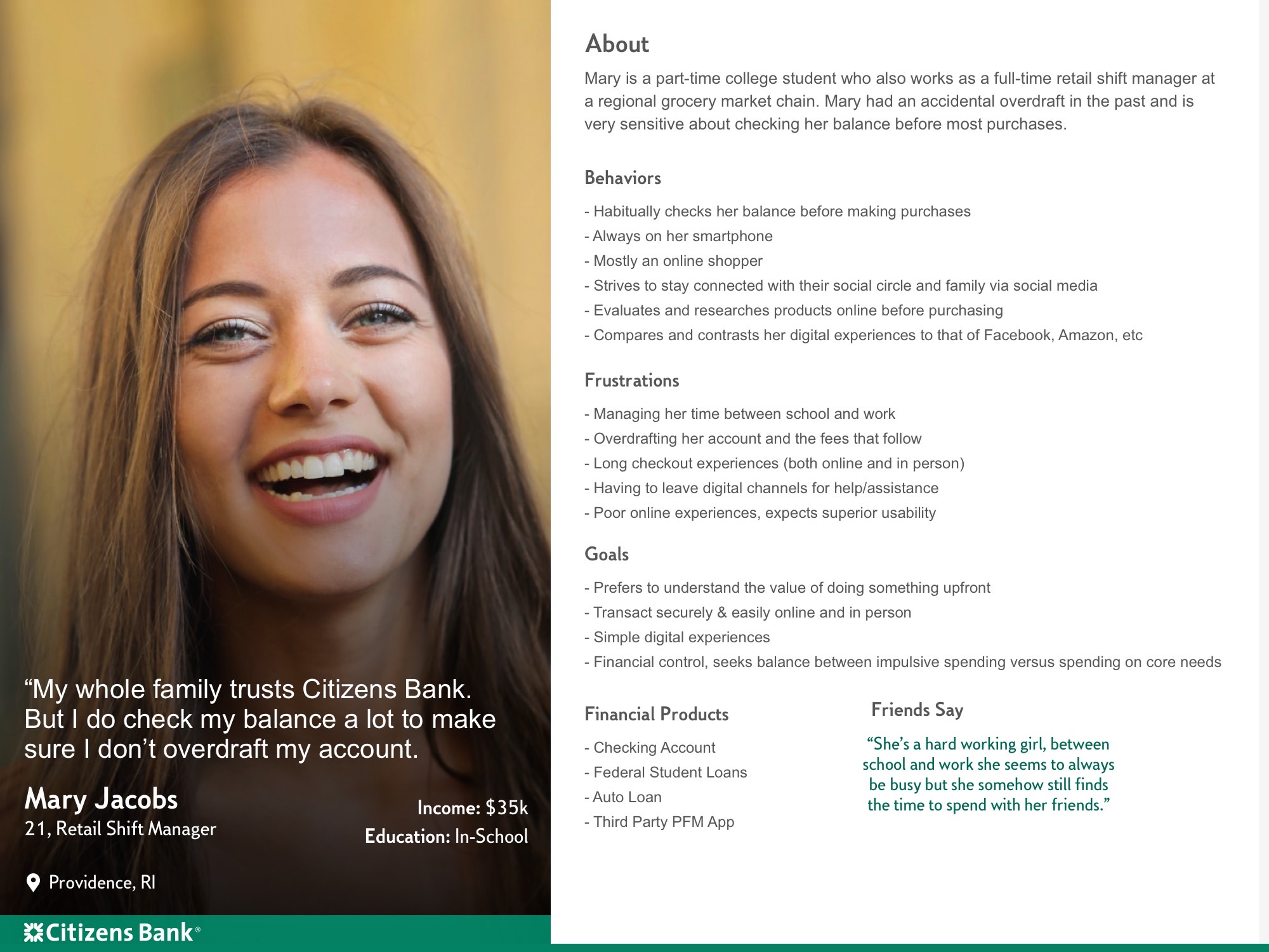 To show the executive committee what a better experience could look like, I introduced a second persona. Mary Jacobs is a twenty-one year old part-time college student who also works full time as a retail shift manager at a regional grocery market chain. She lives in Providence and earns roughly thirty-five thousand dollars a year. She has had an accidental overdraft in the past, which is why she checks her balance carefully before almost every purchase.