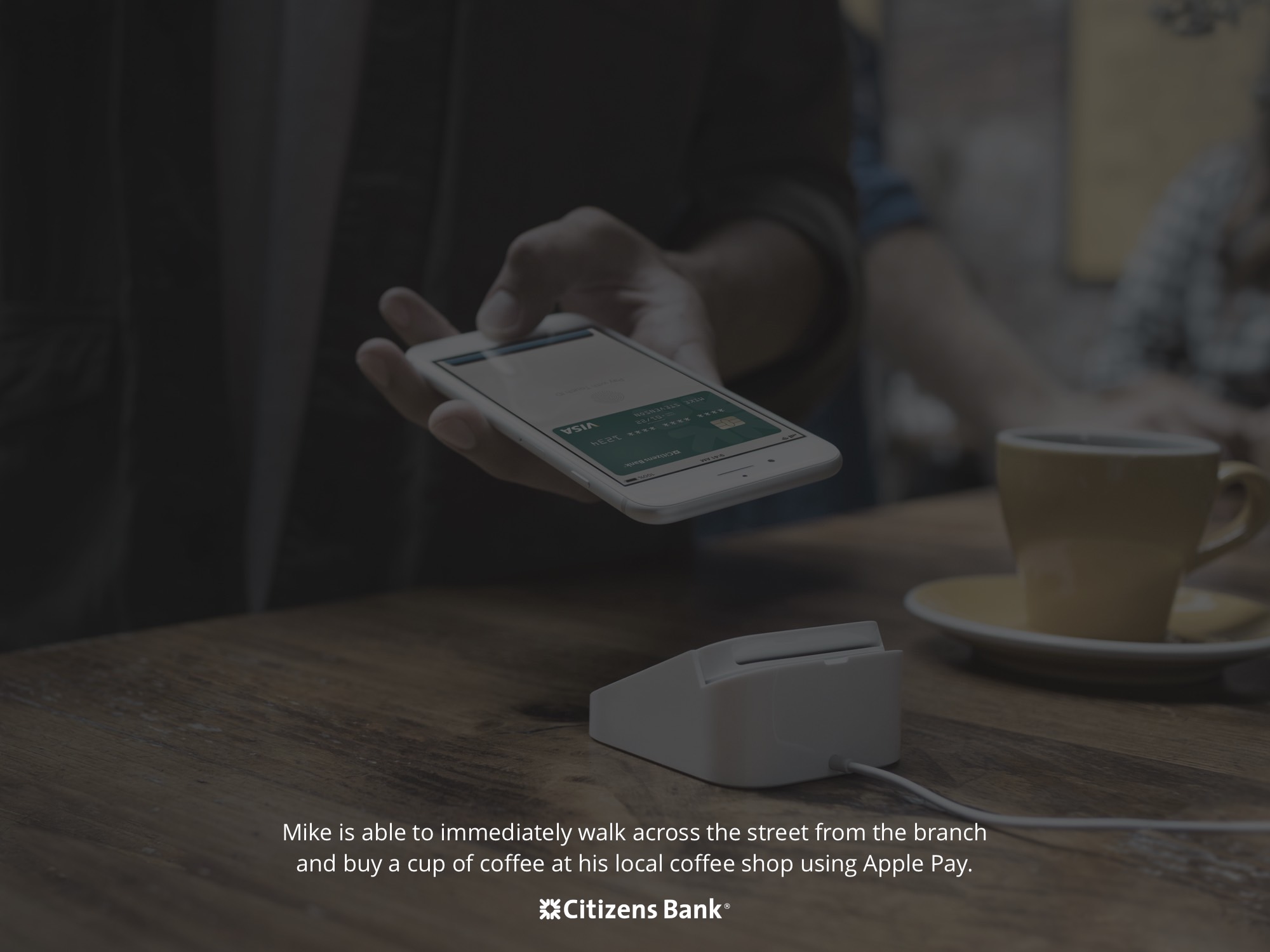 Mike leaves the branch and walks across the street to a local coffee shop. He orders a coffee, taps his phone at the reader, and pays for it with the Citizens debit card he provisioned to Apple Pay only a few minutes earlier. It is a small purchase, but it is the first transaction he makes in the world as a Citizens customer, and it happens before his physical card has even been printed.