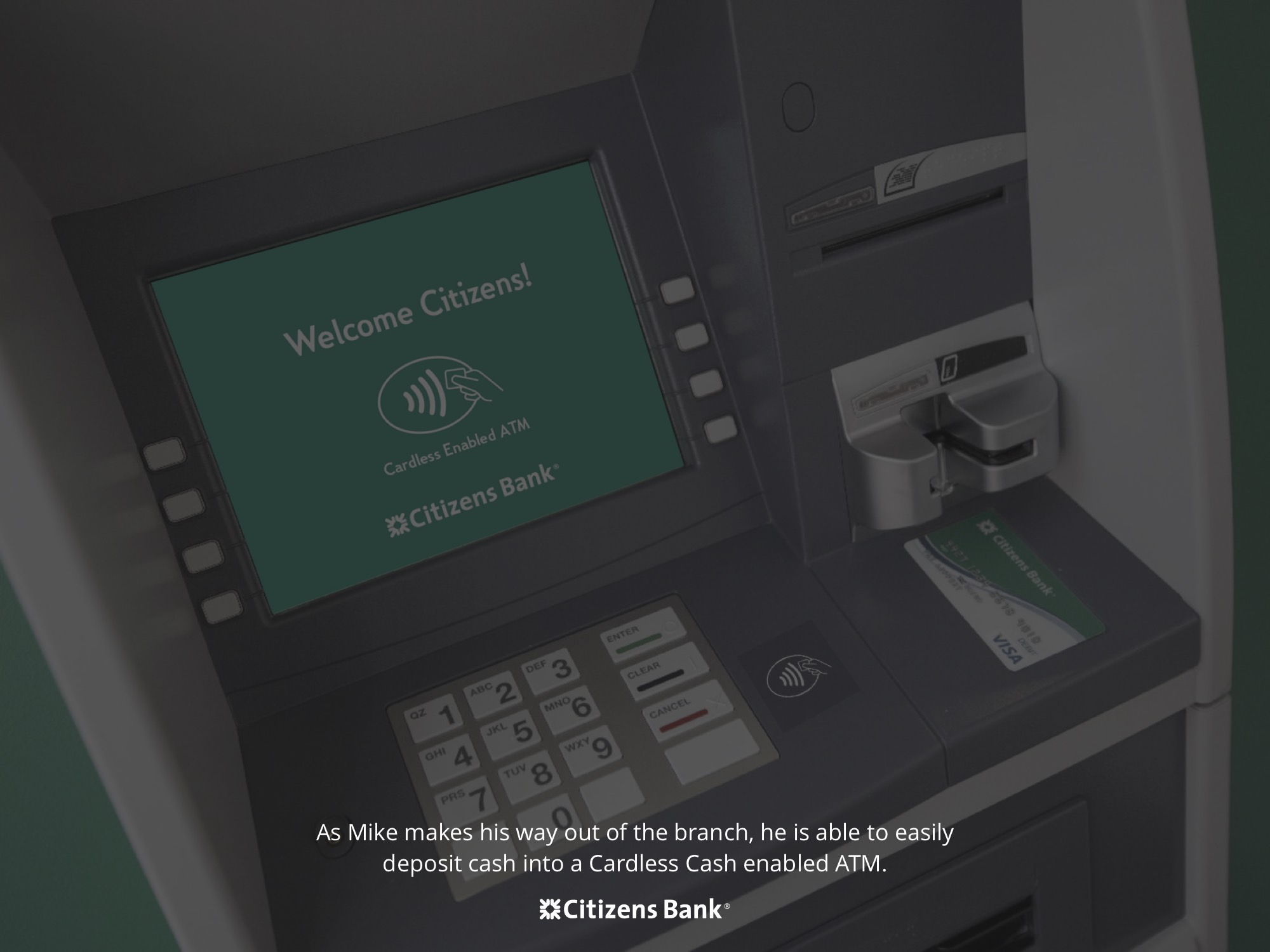 With setup complete, Mike finally stands up and begins to leave. On his way out, he stops at the ATM in the branch lobby to confirm that everything he just configured actually works. Using only his phone, he initiates a cardless cash withdrawal and completes his very first transaction as a Citizens customer, all without a physical card in his wallet.
