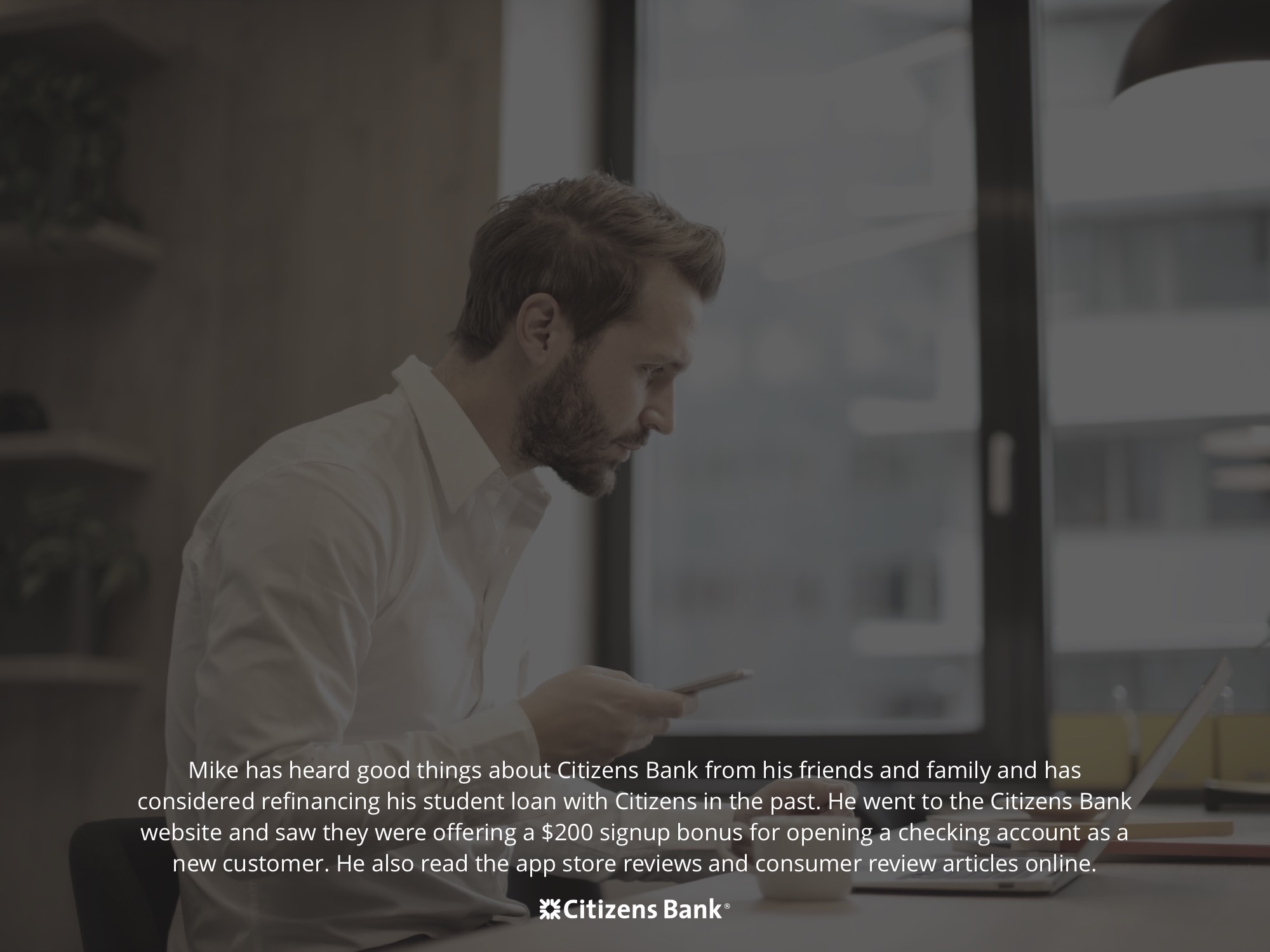 Every customer relationship begins with a decision, and I wanted the committee to feel the weight of that decision from Mike's side of the table. Mike discovers Citizens the way most modern customers discover any financial product: through a combination of digital research, peer recommendations, and a passing impression of the brand in his neighborhood. By the time he is considering us, he has already compared rates, read reviews, and quietly eliminated half a dozen alternatives.