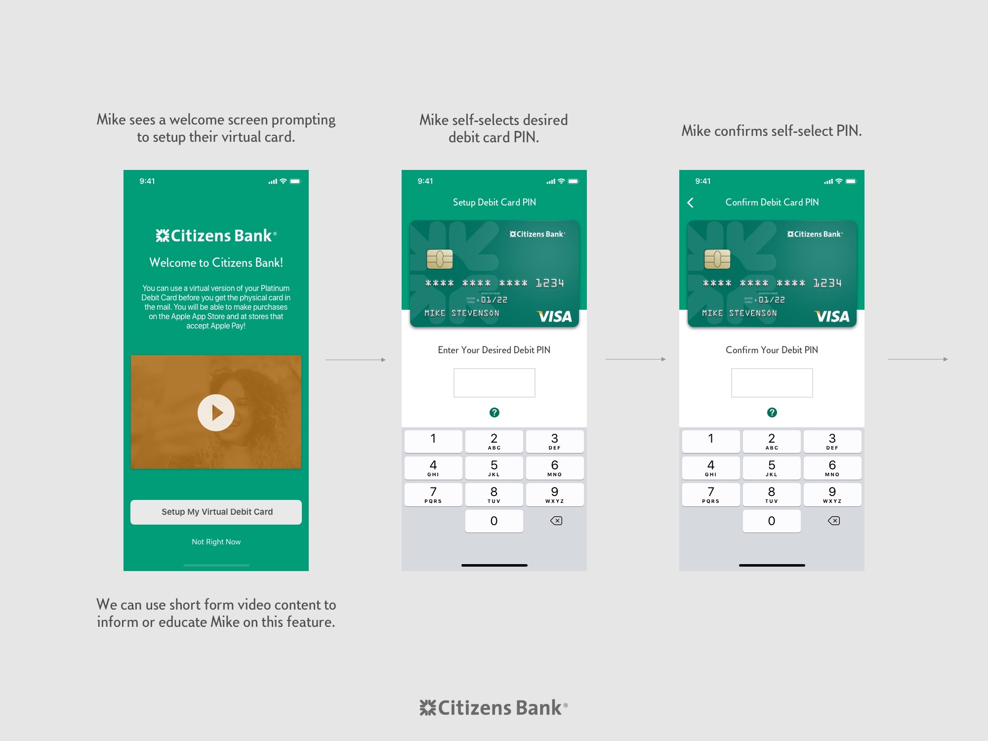 Still inside the branch, Mike continues through the guided onboarding flow and is invited to self-select the PIN for his new Citizens debit card. In the same experience, the app offers to provision his card to his mobile digital wallets, including Apple Pay, Google Pay, and Samsung Pay, so that he can begin transacting immediately without waiting for the physical card to arrive in the mail.