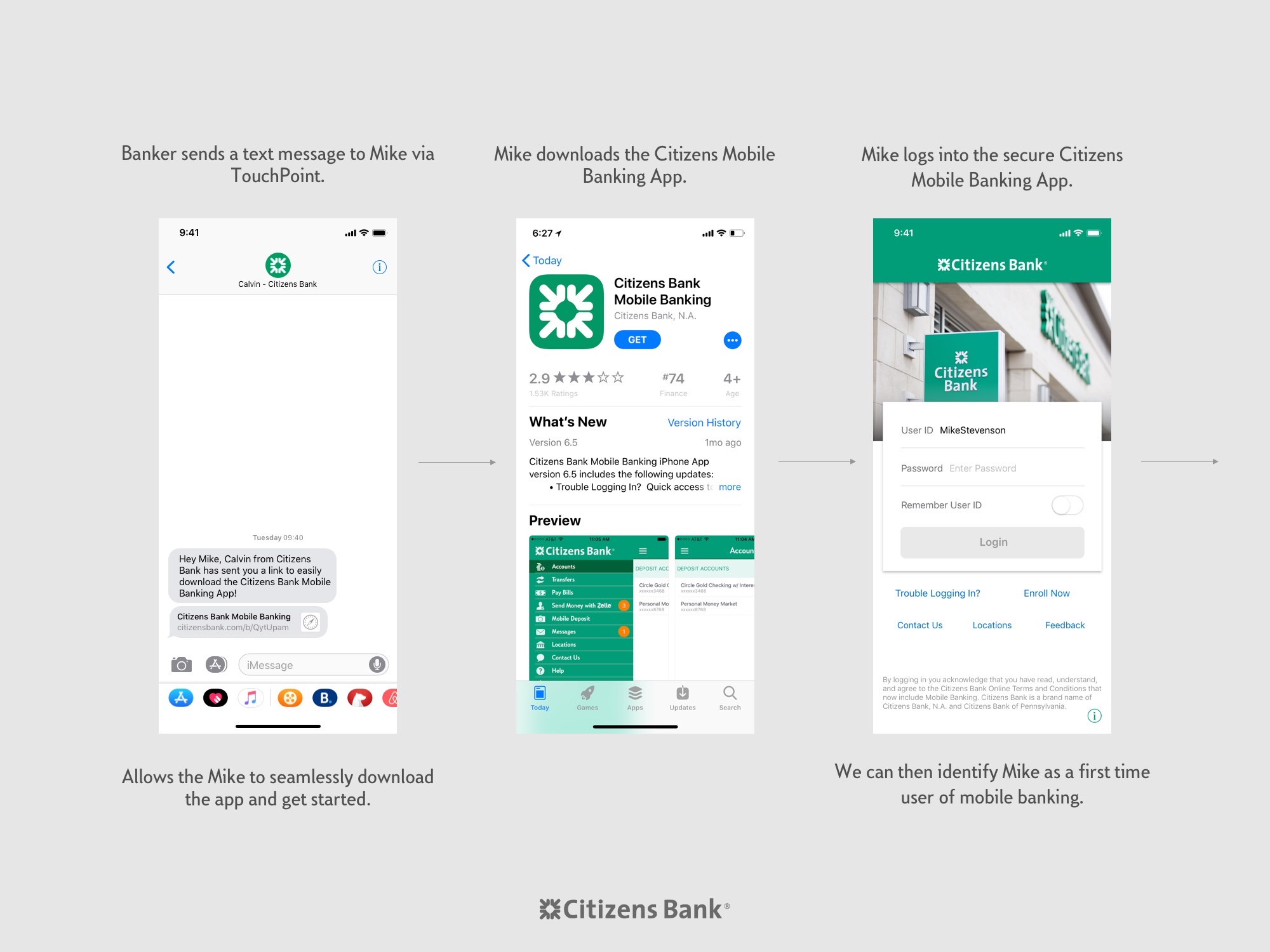 What changed in my proposal was how that conversation ends. Rather than handing Mike a printed brochure and a set of instructions he is likely to lose by the time he gets home, the banker uses Touchpoint to send him a text message directly from the desk. That single text message is the handoff. It carries a trusted link from the banker Mike just met, and it opens the door to the App Store listing for the Citizens Mobile Banking app.