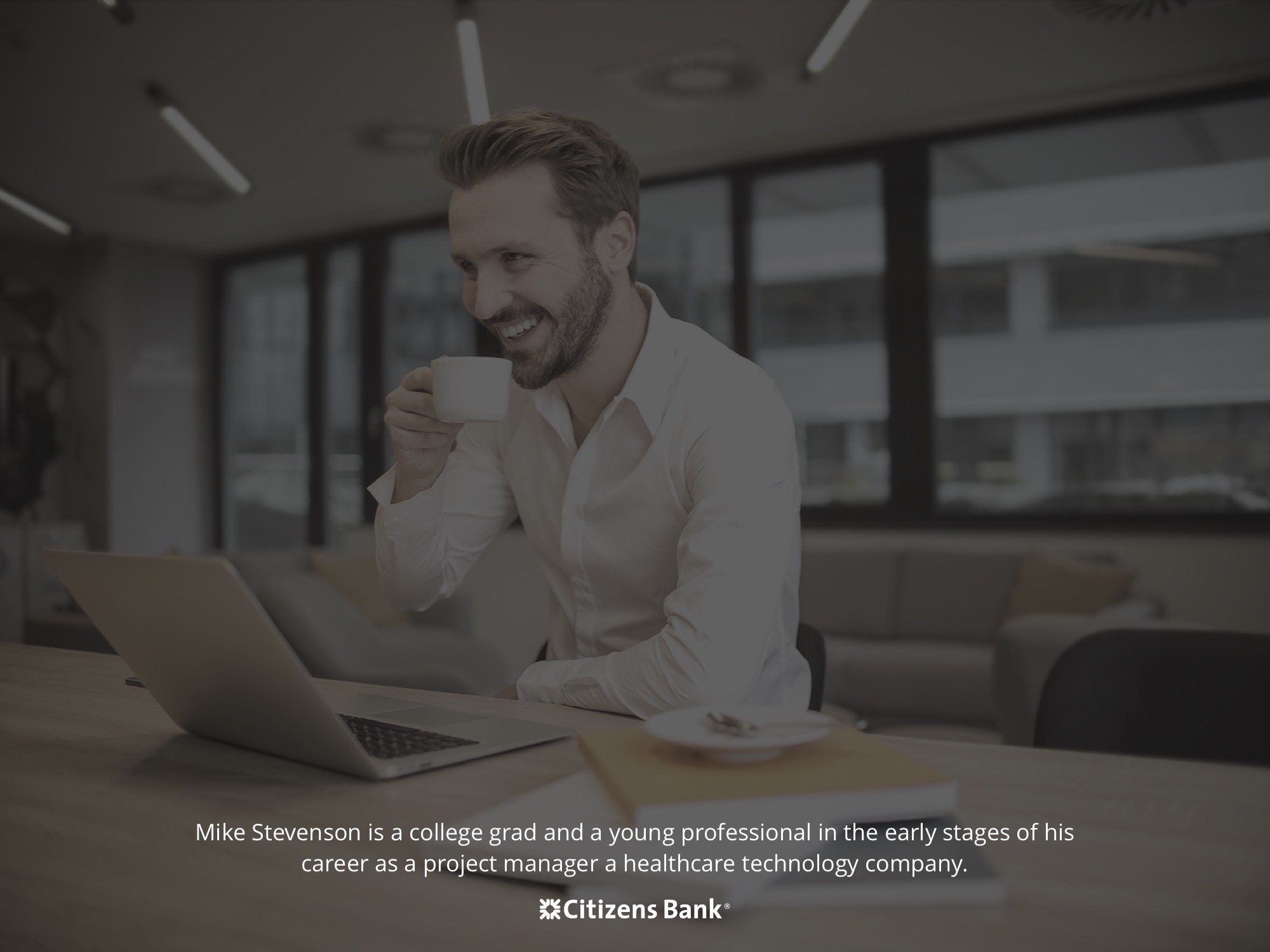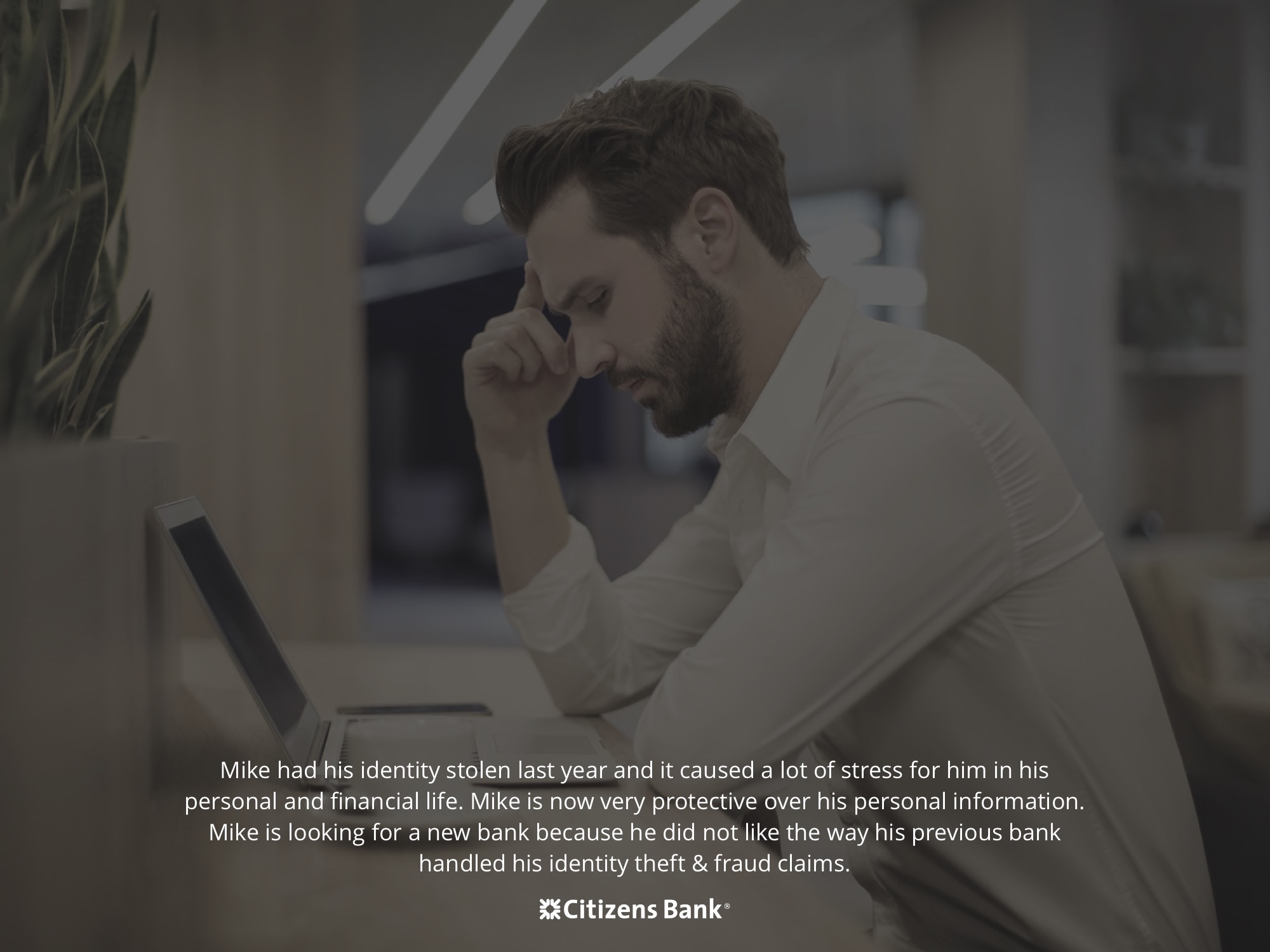Before I could tell the story, I needed a protagonist. I developed a primary persona grounded in voice of the customer research, segmentation data from the Consumer Bank, and qualitative insights from in-branch interviews. The result was Mike Stevenson, a twenty-six year old project manager in Boston who represented the high-value, digitally native customer we were losing to challenger banks and fintech competitors.