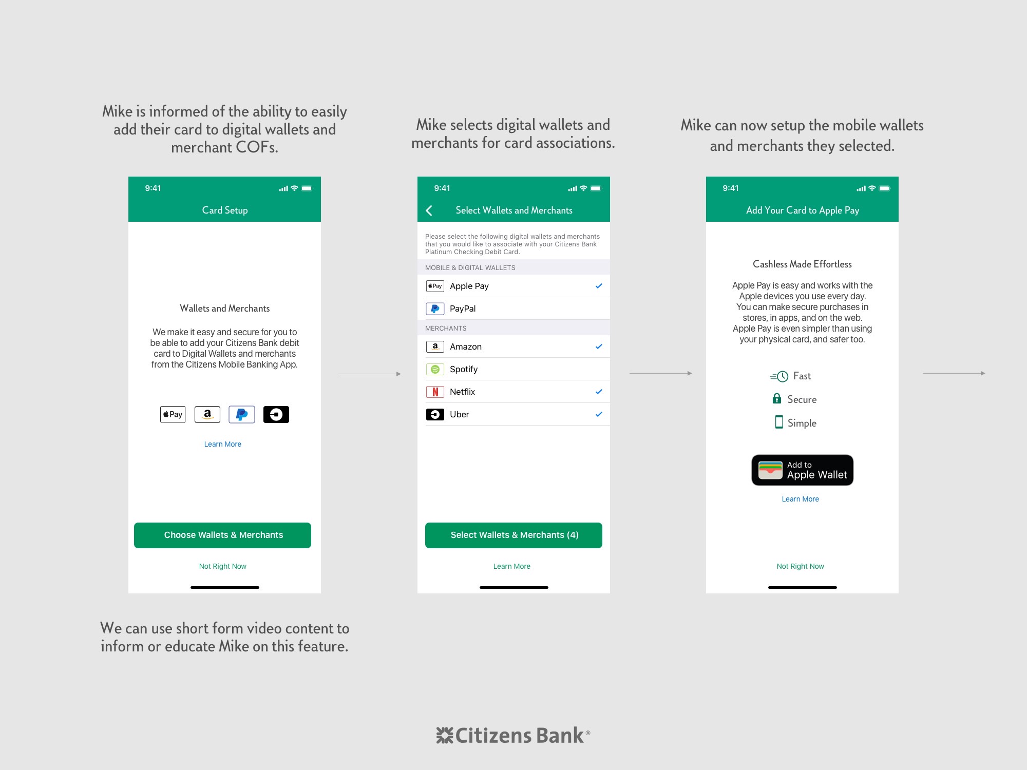 This concept introduced a capability that genuinely excited the executive committee. It reframed the bank as an orchestration layer between the customer and the brands they use every day, rather than a passive source of card numbers. The value proposition was clear: a Citizens customer could update a card once, inside the bank, and have that update flow securely out to every service that relied on it.