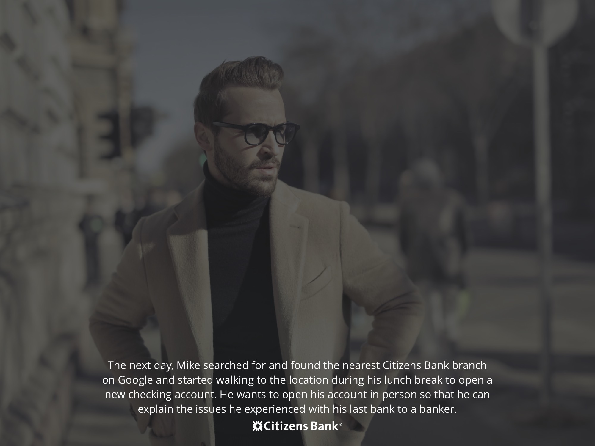 Even for a digital-first customer, the decision to open a new checking account often begins in the physical world. I showed the committee a photograph of Mike approaching a Citizens branch on foot, a familiar urban moment that grounded the abstract idea of acquisition in a recognizable street corner. The branch is still the front door of the relationship for a meaningful share of our customers, and the design of what happens on the other side of that door shapes everything that comes next.