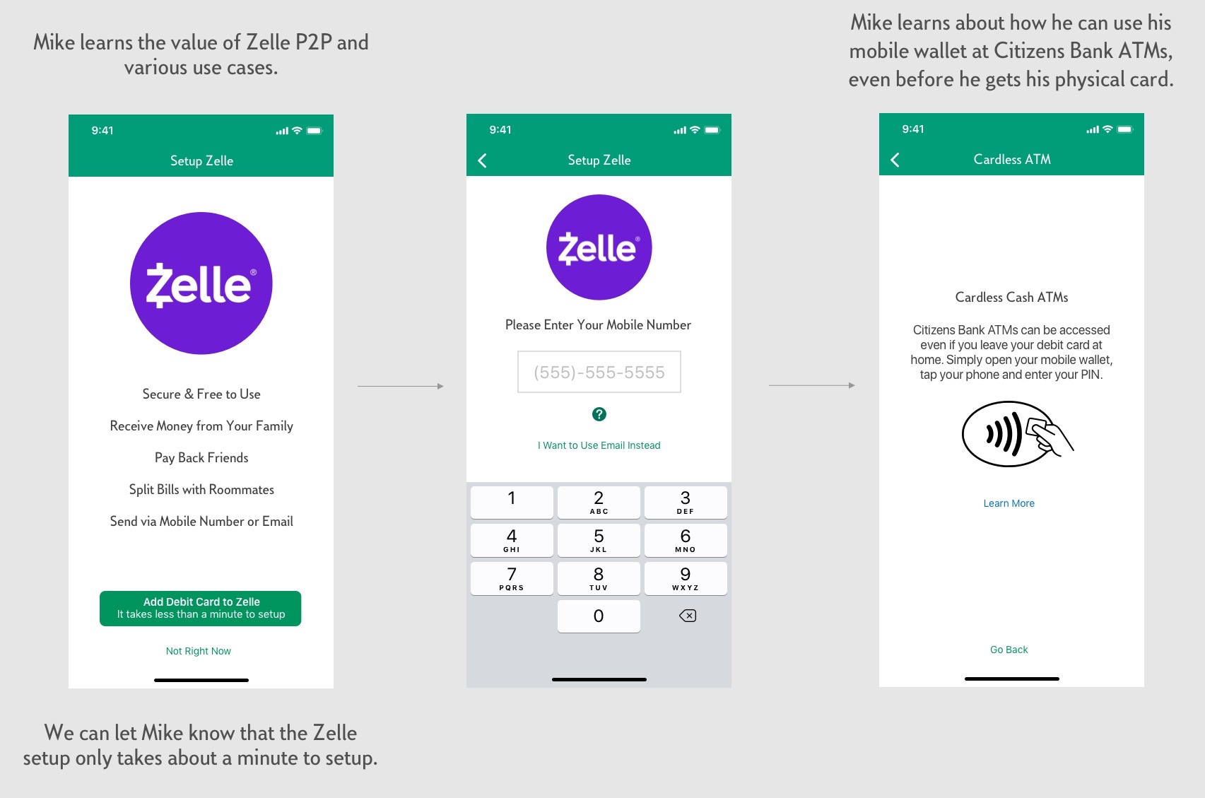 With his account provisioned and his first login complete, Mike is guided through the first of several high-value setup moments, all while he is still sitting inside the branch. The experience walks him through enrolling in Zelle for person-to-person payments and activating cardless cash so that he can withdraw money from a Citizens ATM using only his phone.