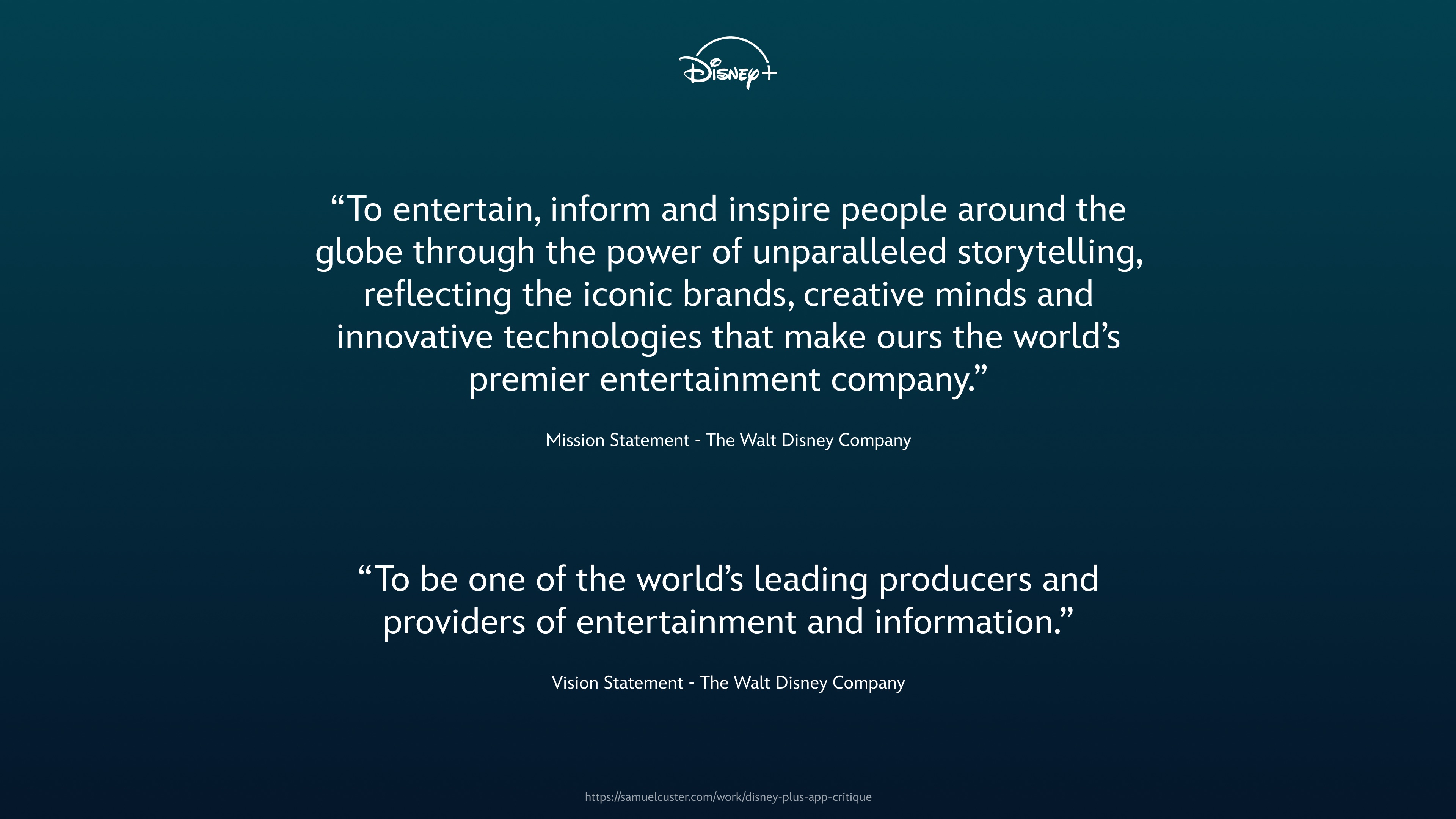 I began by examining Disney's mission and vision statements from the corporate website. Grounding the critique in these principles ensures that proposed improvements align with Disney's stated commitments to storytelling, innovation, and inclusivity, not just UX best practices.