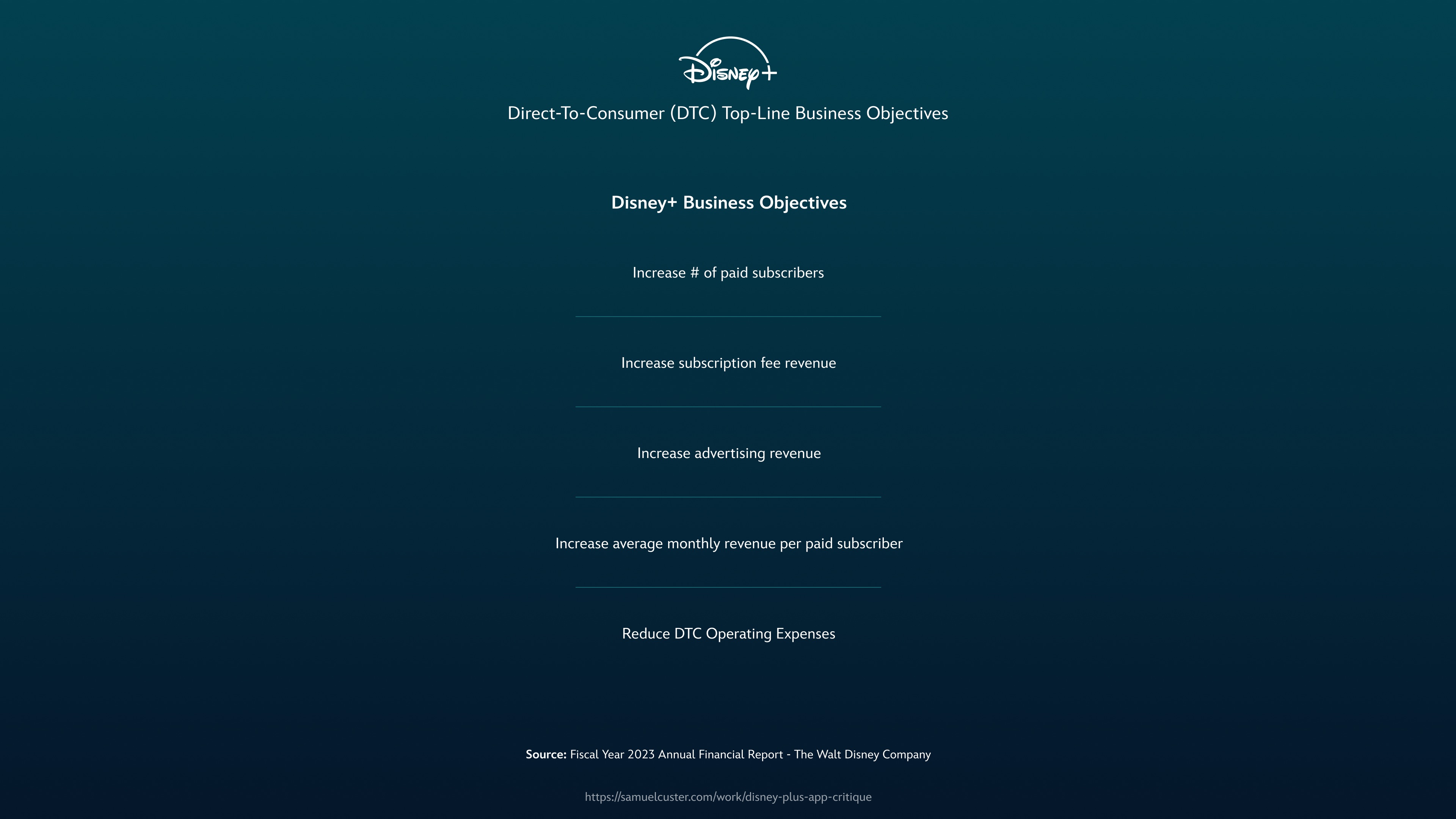 To understand the broader business objectives that influence the development of Disney+, I reviewed The Walt Disney Company's annual report, focusing on the key metrics for its Direct-to-Consumer (D2C) segment, which includes Disney+. The primary success metrics for this line of business include increasing the number of paid subscribers, boosting subscription fee revenue, growing advertising revenue, increasing average monthly revenue per paid subscriber, and reducing D2C operating expenses.