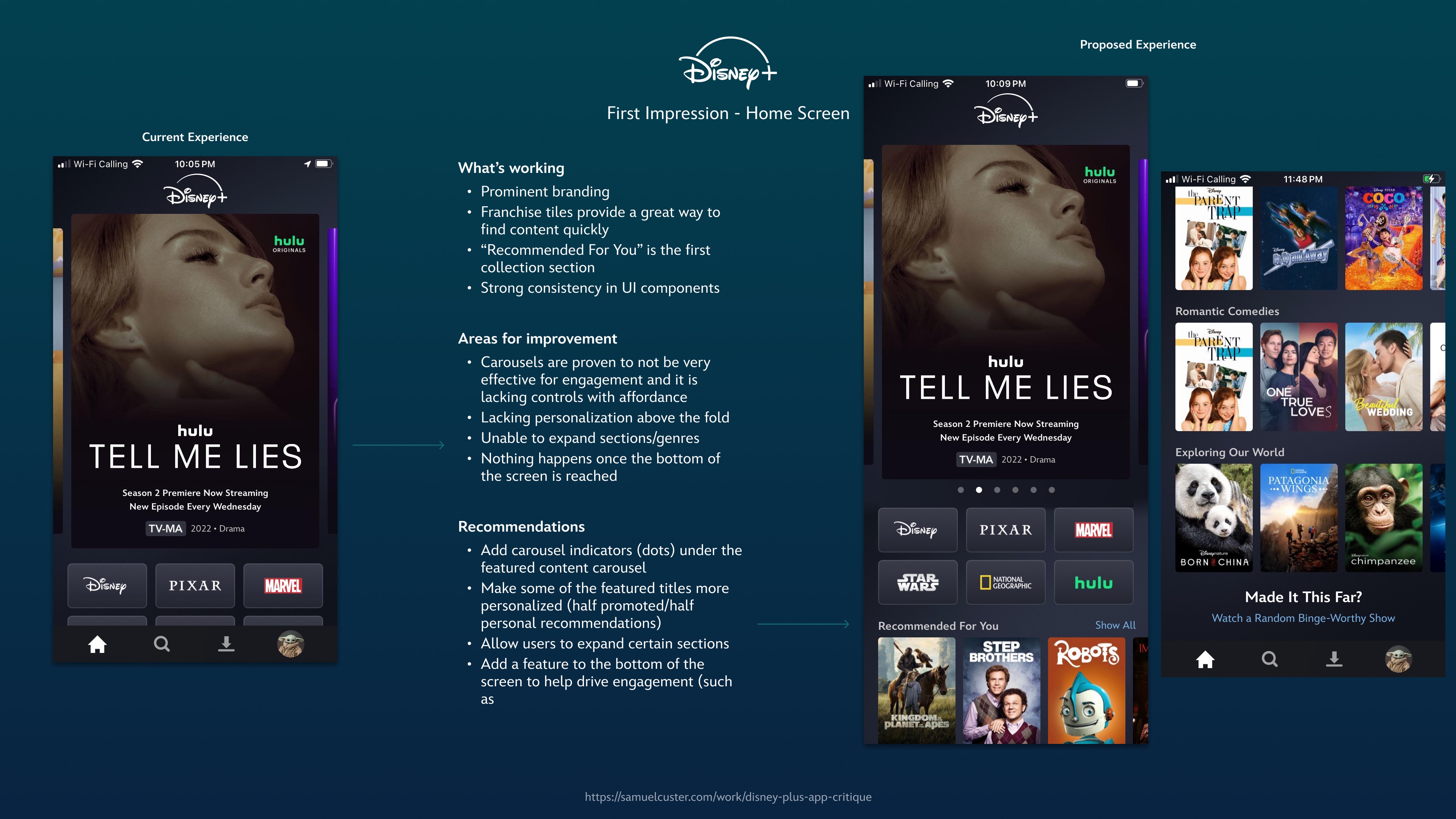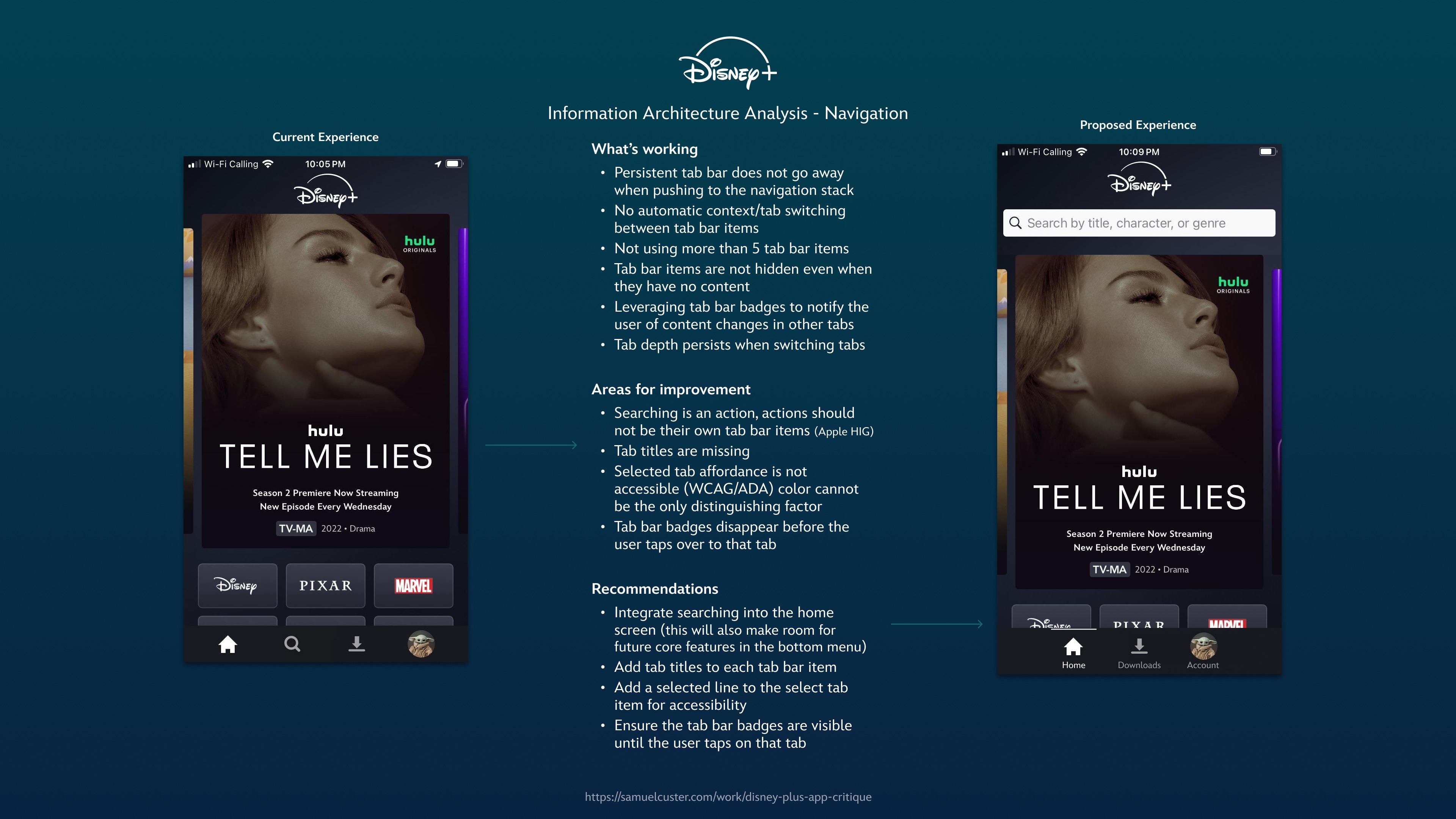 This unsolicited critique examines the Disney+ app across usability, interaction flow, visual design, and information architecture, proposing solutions that enhance the user experience and demonstrate how strategic design methodology informs product evolution at scale.