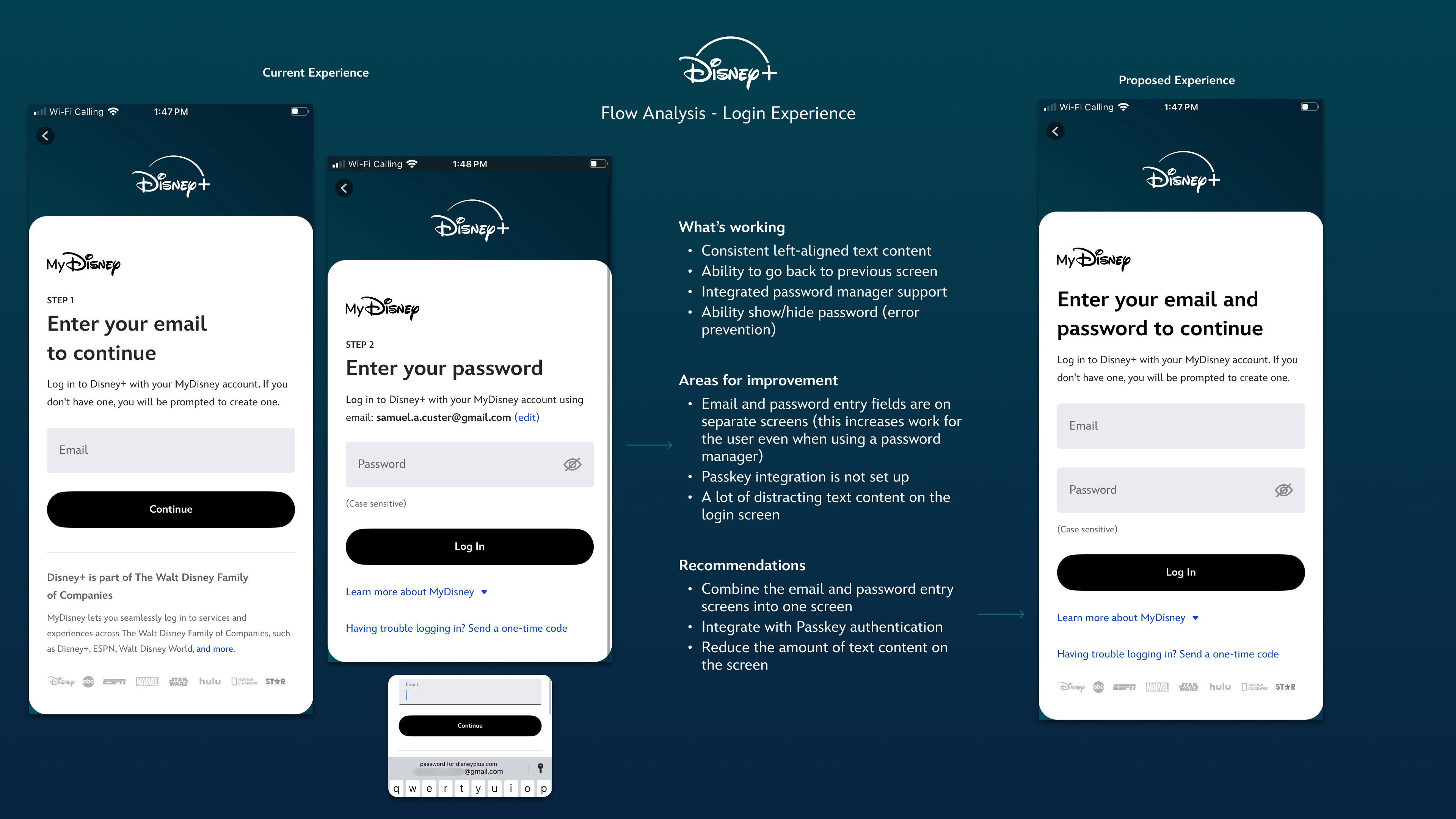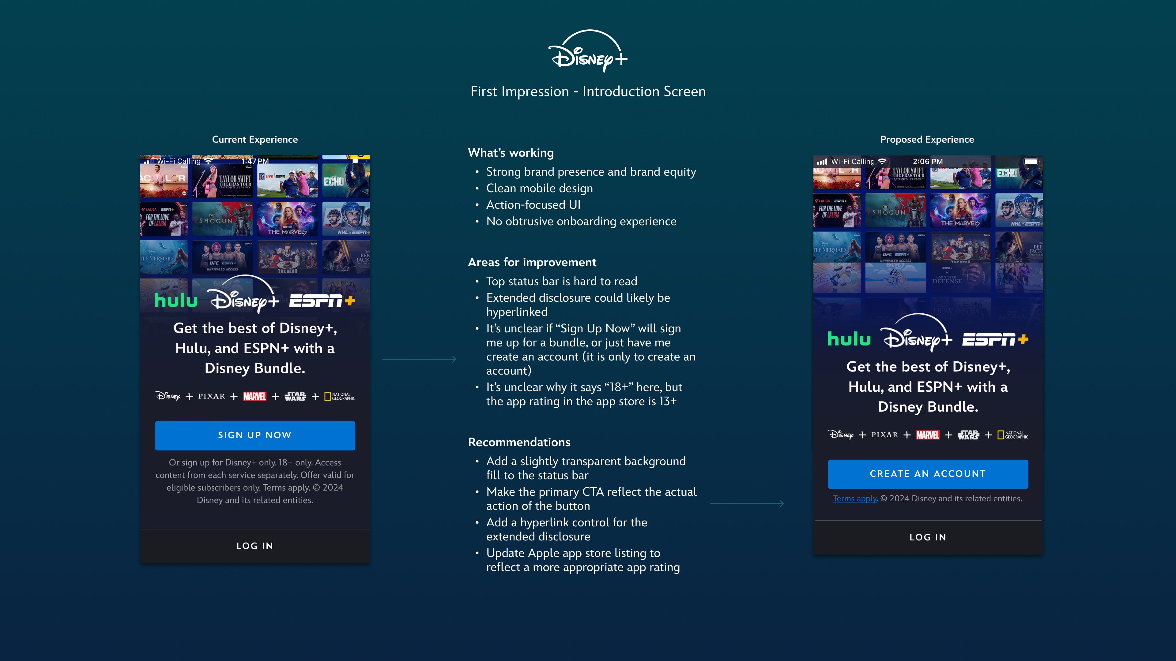 My first impression of the Disney+ login screen is broken down into three stages: what is working, areas for improvement, and recommendations. Each screen review will follow this same approach. Details, along with before-and-after concepts and a full breakdown, are included in the visual artifact that follows.