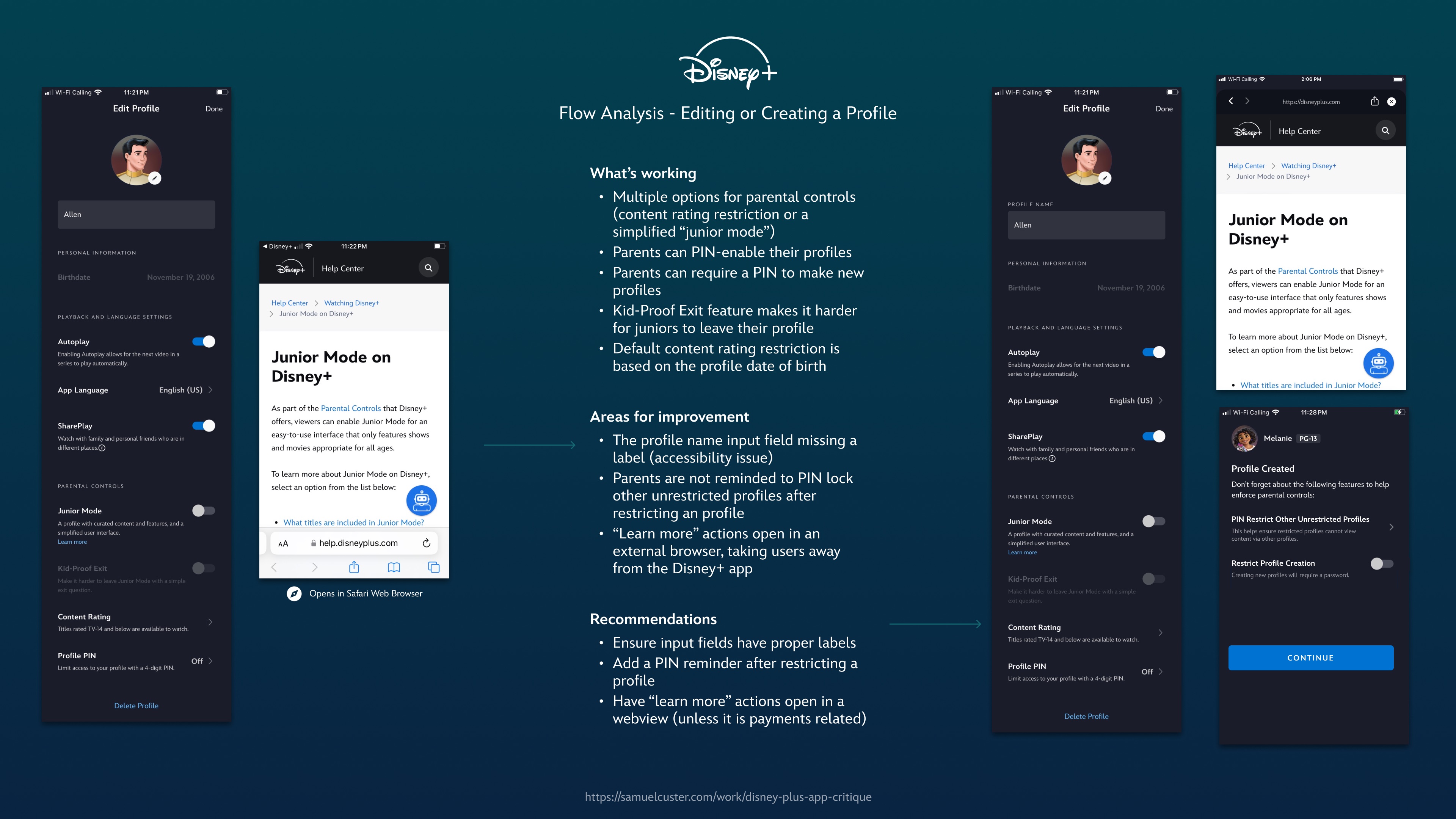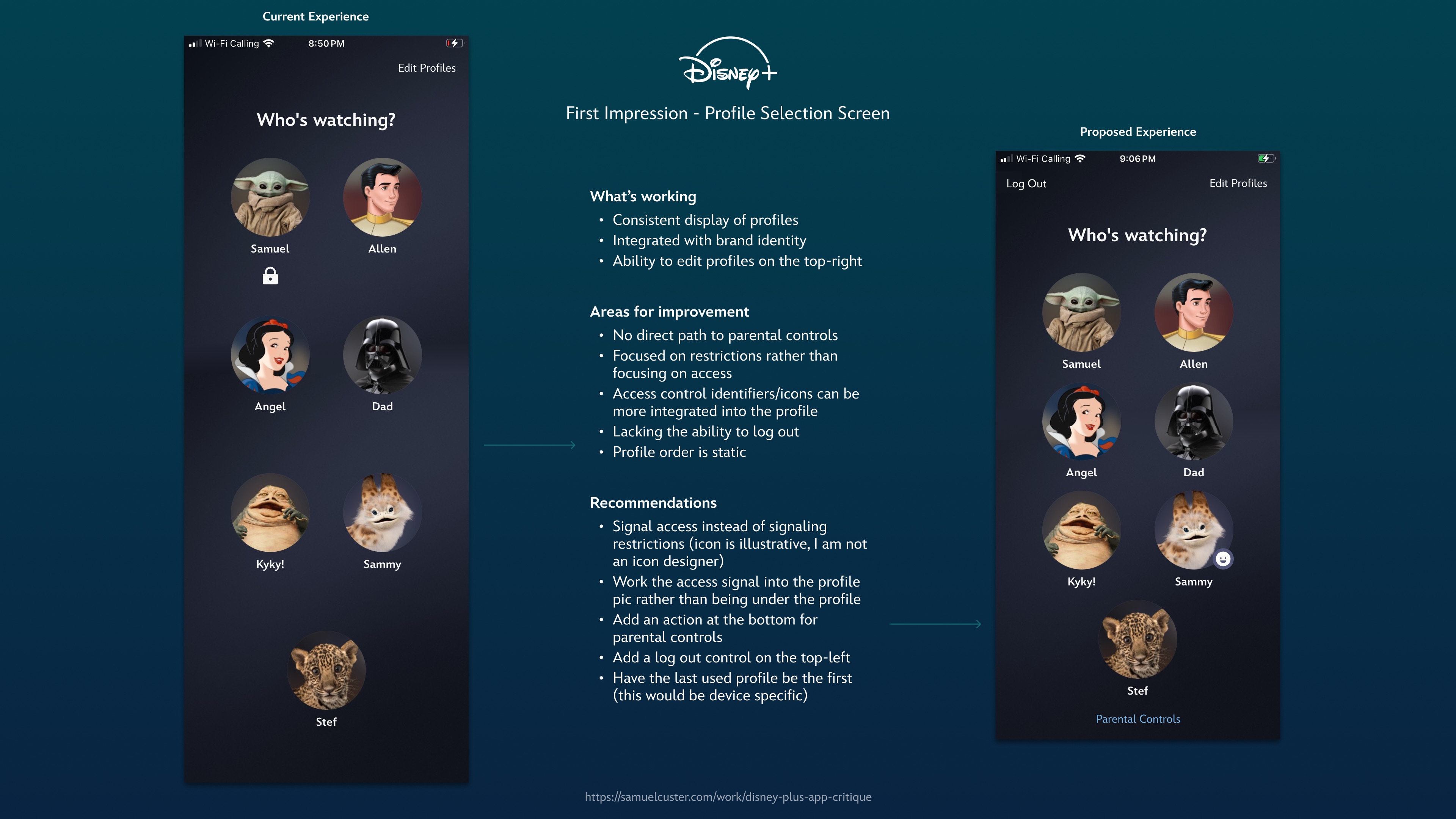 From there, I turned to the profile selection screen that subscribers encounter at the start of every session, with particular attention to access control, parental controls, and account management. The accompanying visual artifact walks through the strengths, gaps, and recommended adjustments alongside before-and-after concepts.