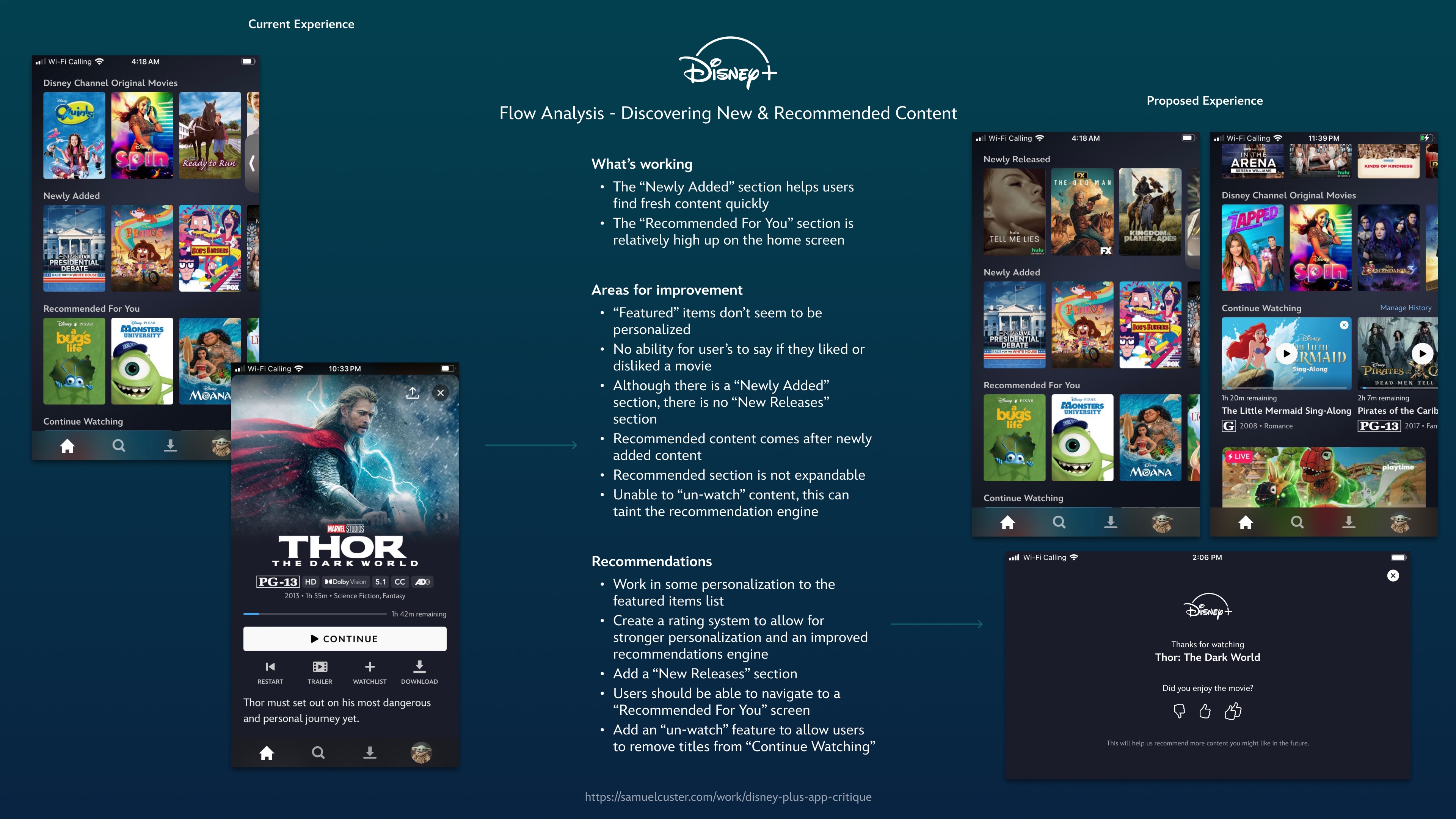 Beyond nostalgia, I examined how subscribers encounter new and recommended content as they move through the home screen, focusing on personalization, ratings feedback, and the recommendation engine that powers it. The featured row, newly added and new releases, and the continue watching experience each played a role in shaping the analysis, which is presented in full alongside before-and-after concepts in the visual artifact below.