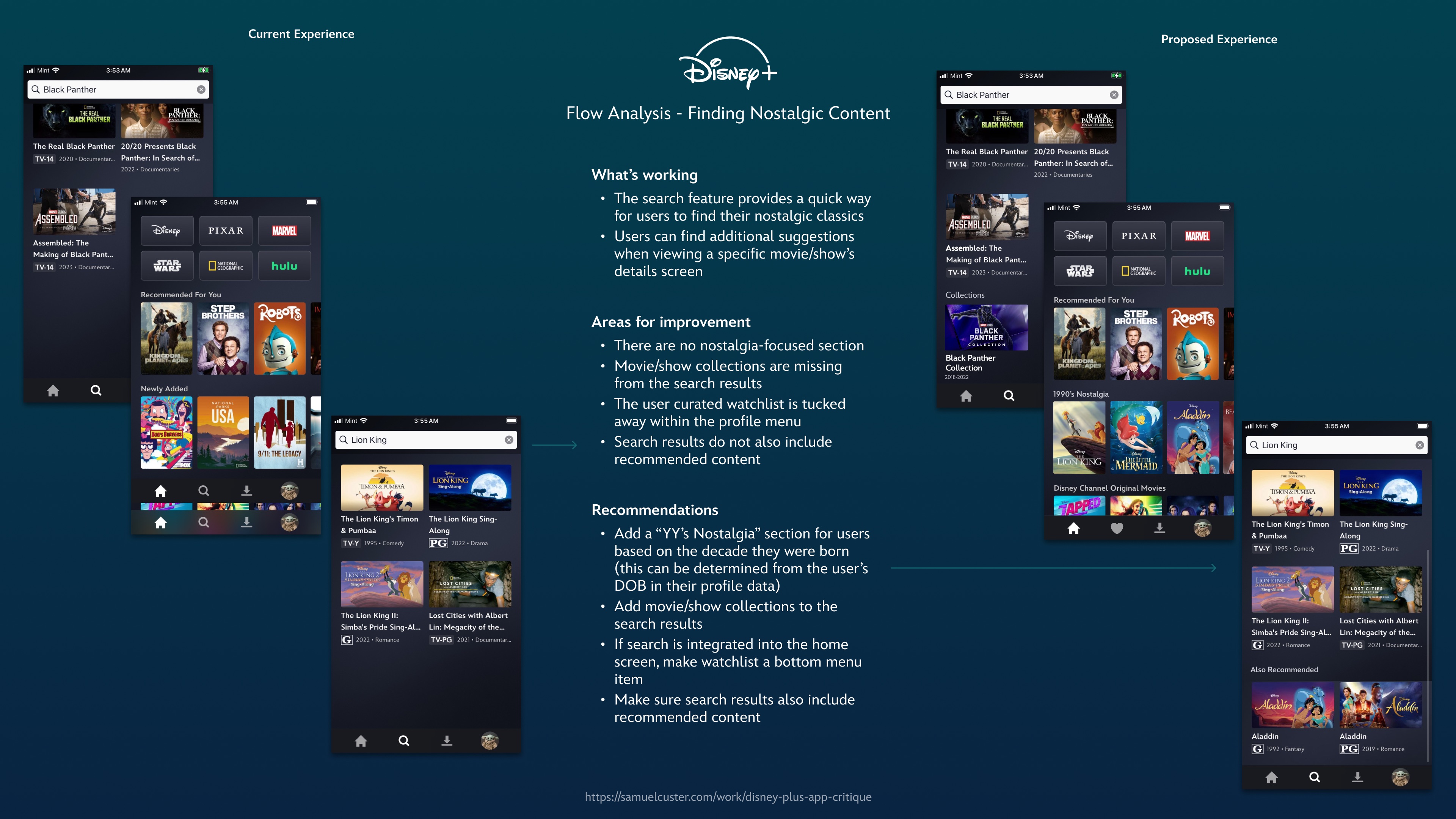 Returning to the emotional goals identified earlier in the user research, I traced the path a subscriber takes when searching for nostalgic titles. The search experience, results presentation, and opportunities for nostalgia-driven personalization were each evaluated for how well they honor that emotional intent, with the full breakdown and before-and-after concepts captured in the visual artifact that follows.