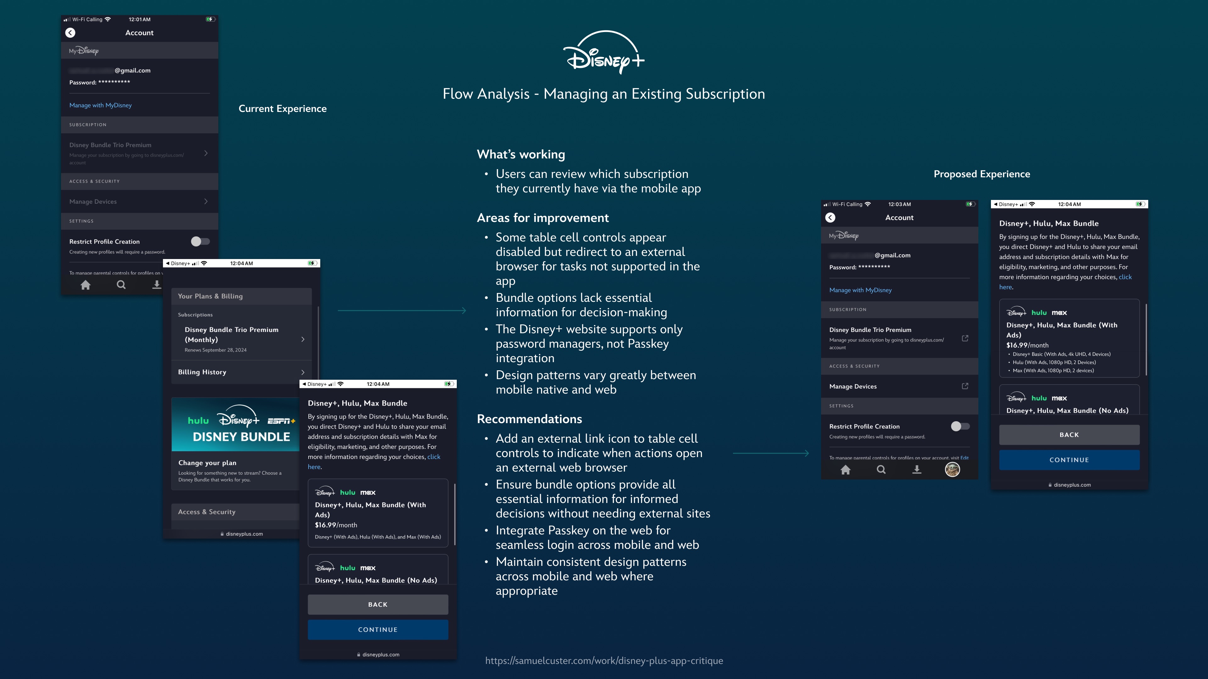 Closing out the evaluation phase, I followed the path a subscriber takes when reviewing or changing an existing subscription, including the handoff between the mobile app and the Disney+ website. Account management, bundle selection, and the consistency of design patterns between the native and web experiences each surfaced friction worth addressing, with the complete analysis and before-and-after concepts laid out in the visual artifact that follows.