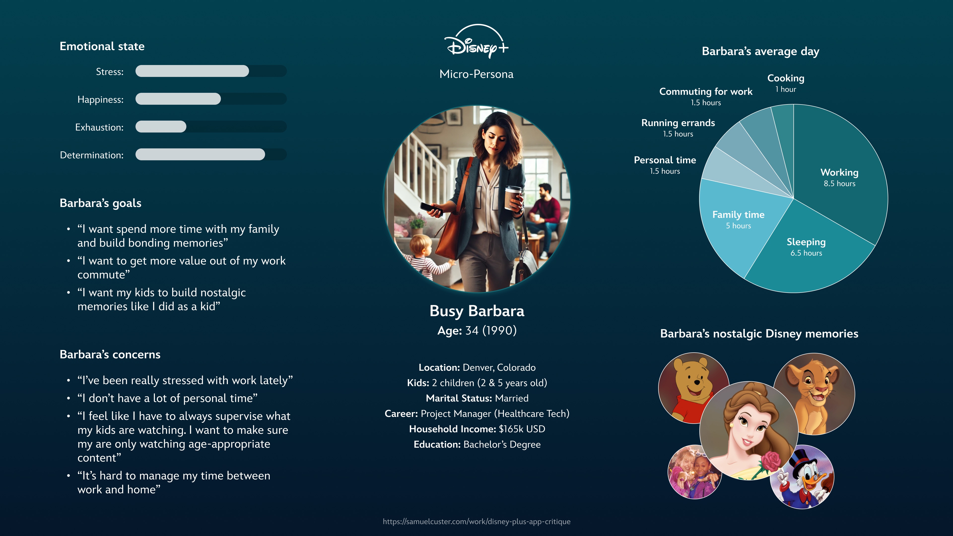 Shifting focus from business metrics to the user, I developed what I call a "Micro Persona" to foster empathy across teams such as product, engineering, and design. This one-page asset includes essential demographic data, an AI-generated image of the persona in their daily life, and insights into their emotional state, goals, and concerns. It also explores how they typically spend their day and highlights the Disney franchises that hold nostalgic value for them.