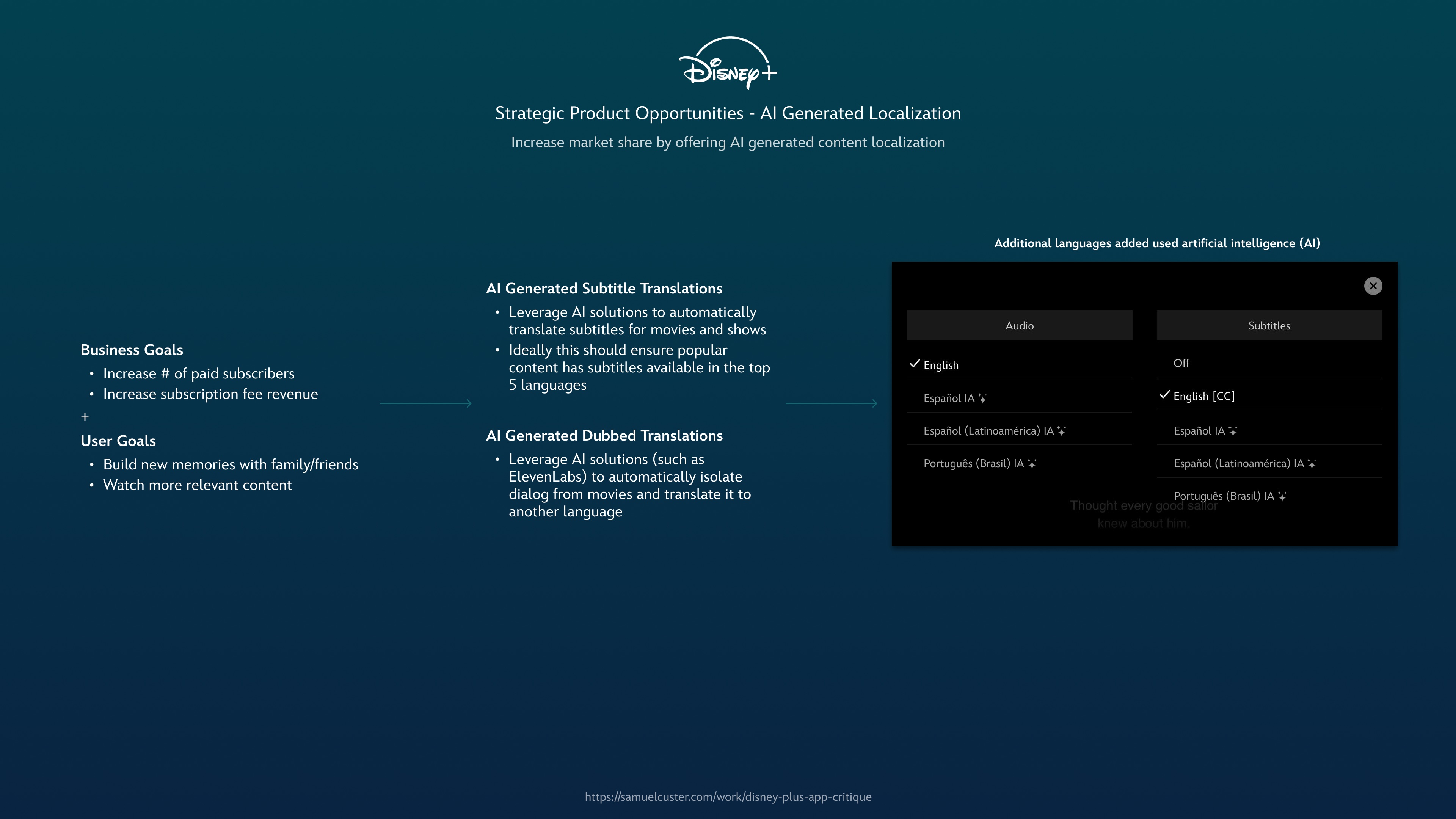 Shifting from evaluation to ideation, I outlined a strategic product opportunity that ties directly back to the business goals and user goals defined earlier in this critique. This concept proposes leveraging AI to automatically generate subtitle translations and dubbed audio for existing content, expanding the reach of Disney+ into new markets while helping subscribers watch more relevant content with the people they care about. Details on the underlying goals, the proposed approach, and a sample of the player experience are included in the visual artifact that follows.