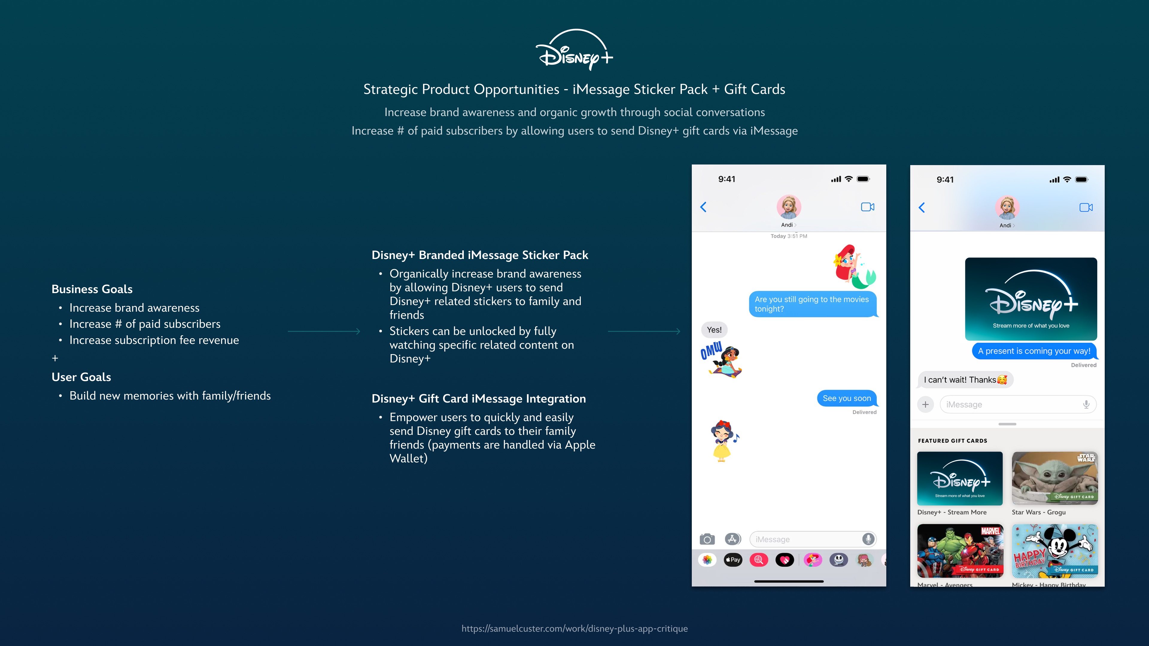 Continuing the shift from evaluation to ideation, I outlined a fourth strategic product opportunity that ties back to both the business goals and user goals defined earlier in this critique. This concept proposes two complementary iMessage integrations: a Disney+ branded sticker pack that drives organic brand awareness through everyday social conversations, and a native gift card experience that allows subscribers to send Disney+ subscriptions and themed gift cards directly within iMessage using Apple Wallet. Together, these integrations create new pathways for subscriber acquisition while deepening emotional connection with the brand. Details on the underlying goals, the proposed approach, and concepts for both the sticker pack and gift card experiences are included in the visual artifact that follows.