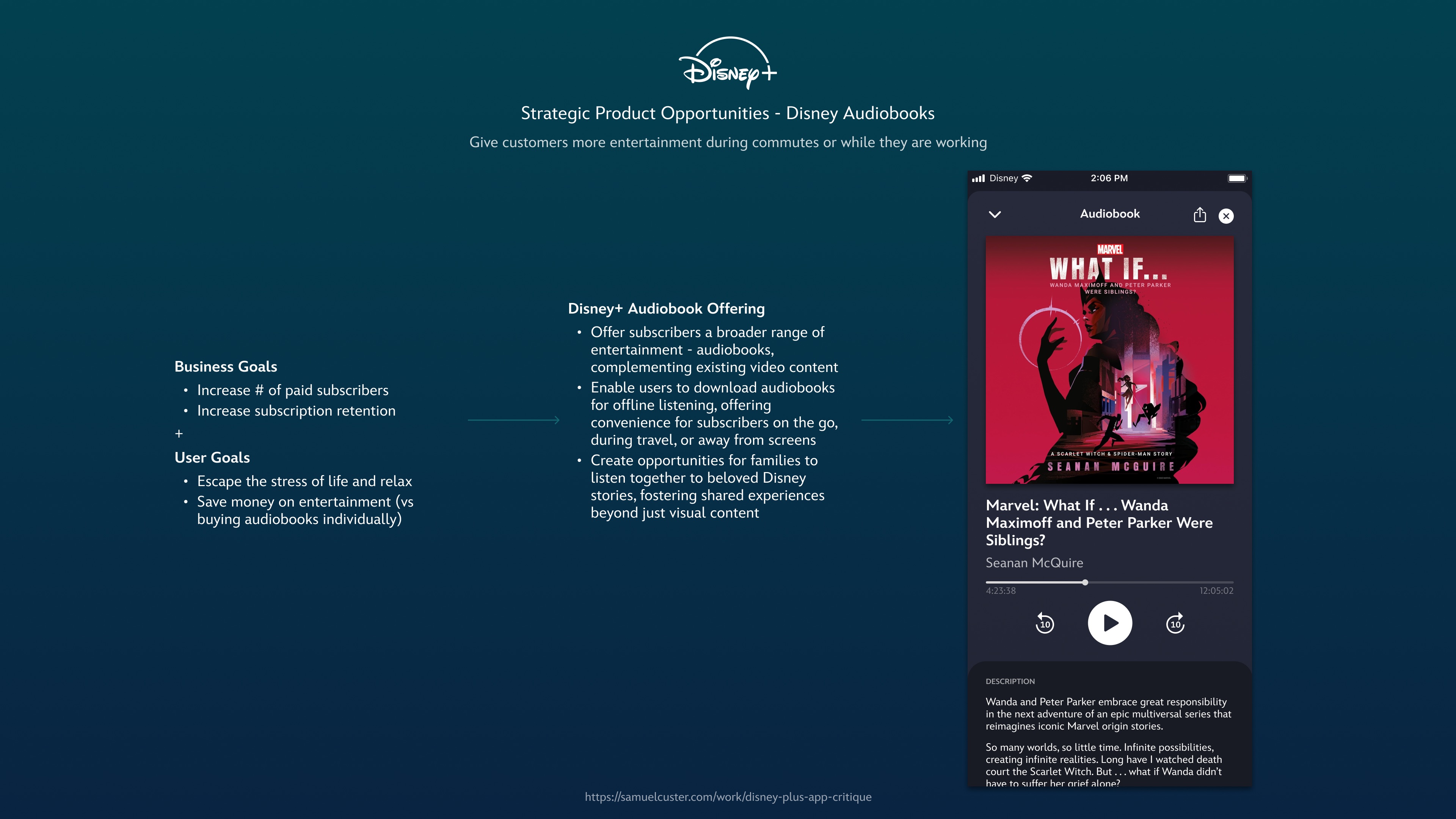 Continuing the shift from evaluation to ideation, I outlined a third strategic product opportunity that ties back to both the business goals and user goals defined earlier in this critique. This concept proposes extending the Disney+ subscription beyond video to include an audiobook offering, giving subscribers a way to engage with beloved Disney stories during commutes, while working, or away from screens. Details on the underlying goals, the proposed approach, and a sample of the audiobook player are included in the visual artifact that follows.