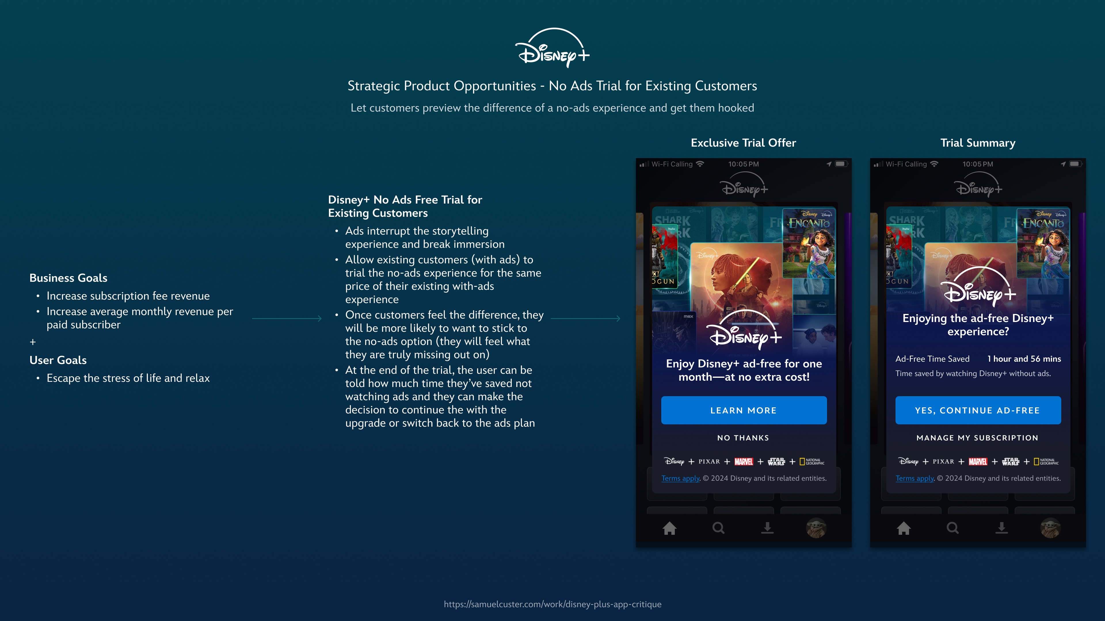 Continuing the shift from evaluation to ideation, I outlined a second strategic product opportunity that ties back to both the business goals and user goals defined earlier in this critique. This concept proposes giving existing with-ads subscribers a limited preview of the no-ads experience, then surfacing the time they saved at the end of the trial as a moment of decision to upgrade. Details on the underlying goals, the proposed approach, and concepts for the trial offer and trial summary screens are included in the visual artifact that follows.