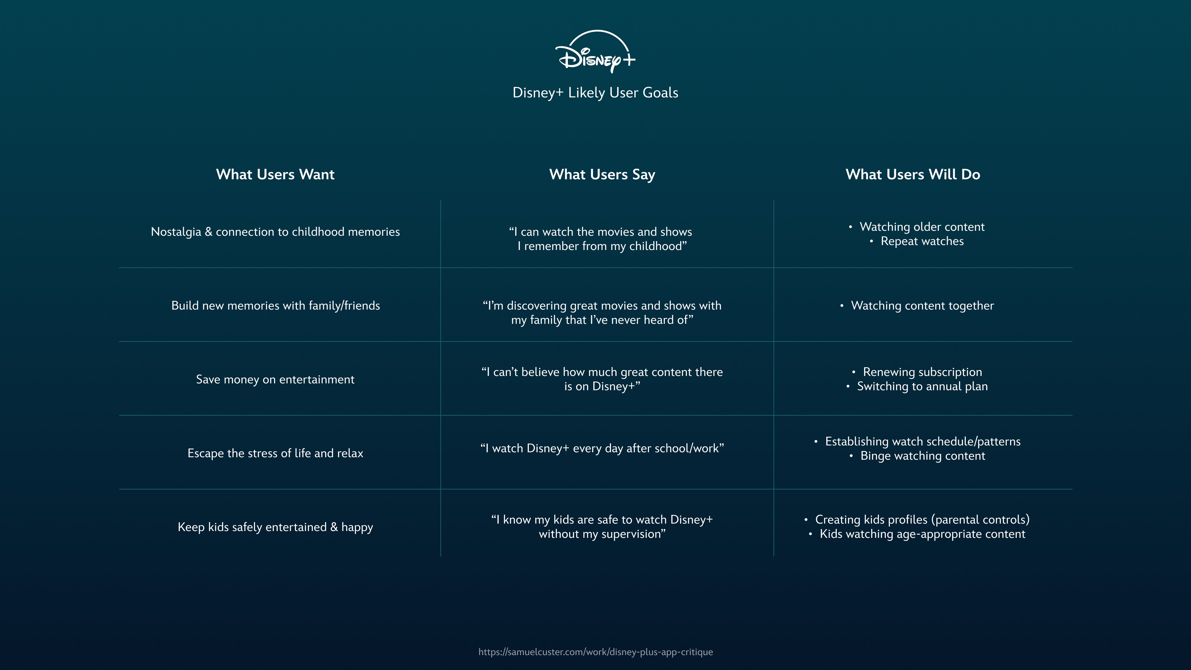 I organized the user goals into three categories: deep emotional goals (what users want), the things users say that reflect those deep goals (what users say), and the measurable behaviors that indicate whether those goals are being met (what users will do). For example, a deep emotional goal might be building new memories with family and friends, which users may express by saying things like "I can watch the movies and shows I remember from my childhood". Measurable behaviors would include increased engagement with older Disney content or rewatching specific nostalgic titles.