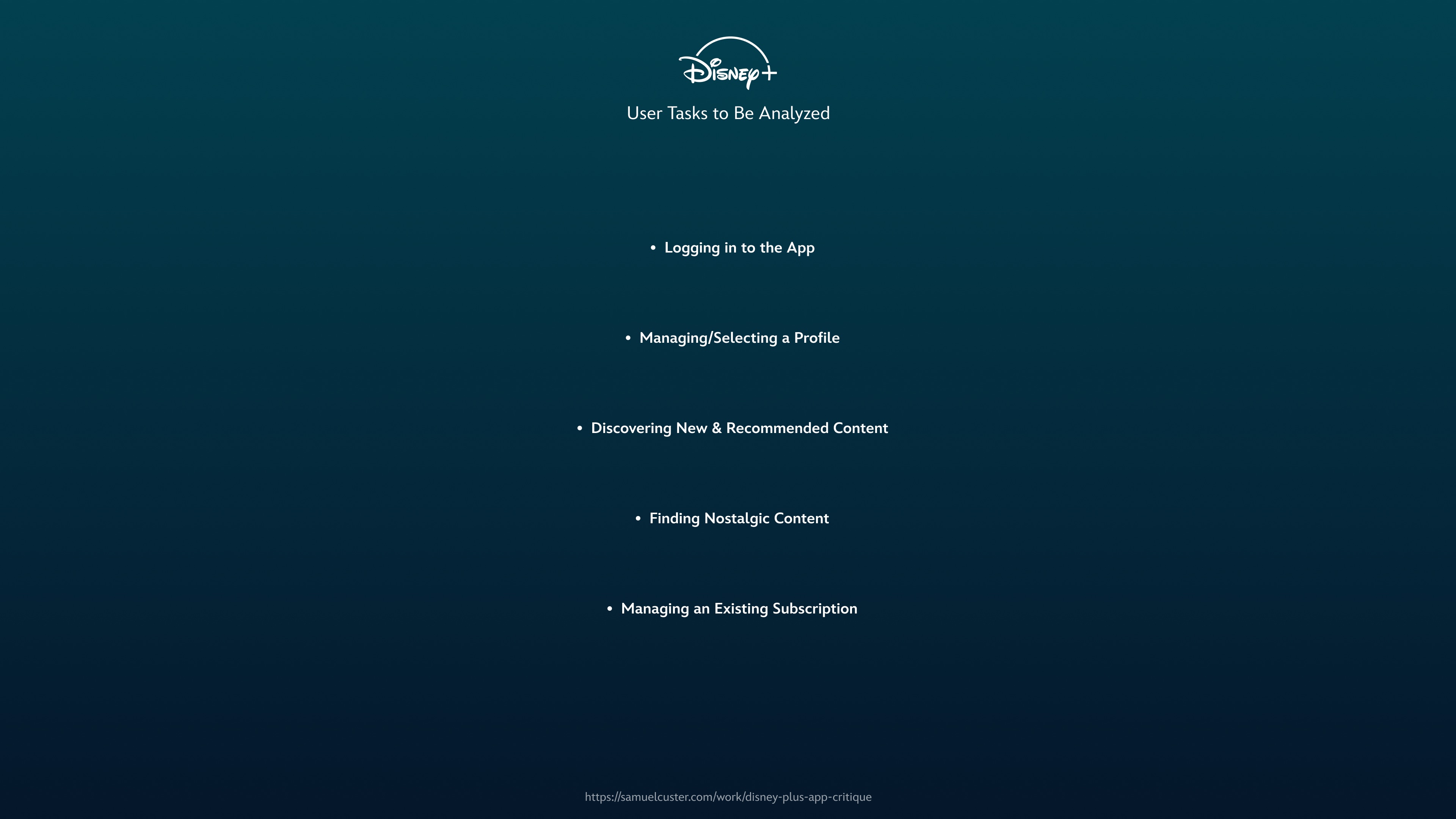 In my analysis, I will focus on key user tasks that are central to the Disney+ app experience. These tasks include navigating the home screen, searching for content, managing user profiles, and engaging with personalized recommendations. Each task represents a critical touchpoint in the user journey and will be examined for its ease of use, alignment with user goals, and impact on the user experience. The specific tasks are outlined in the visual artifact that follows.
