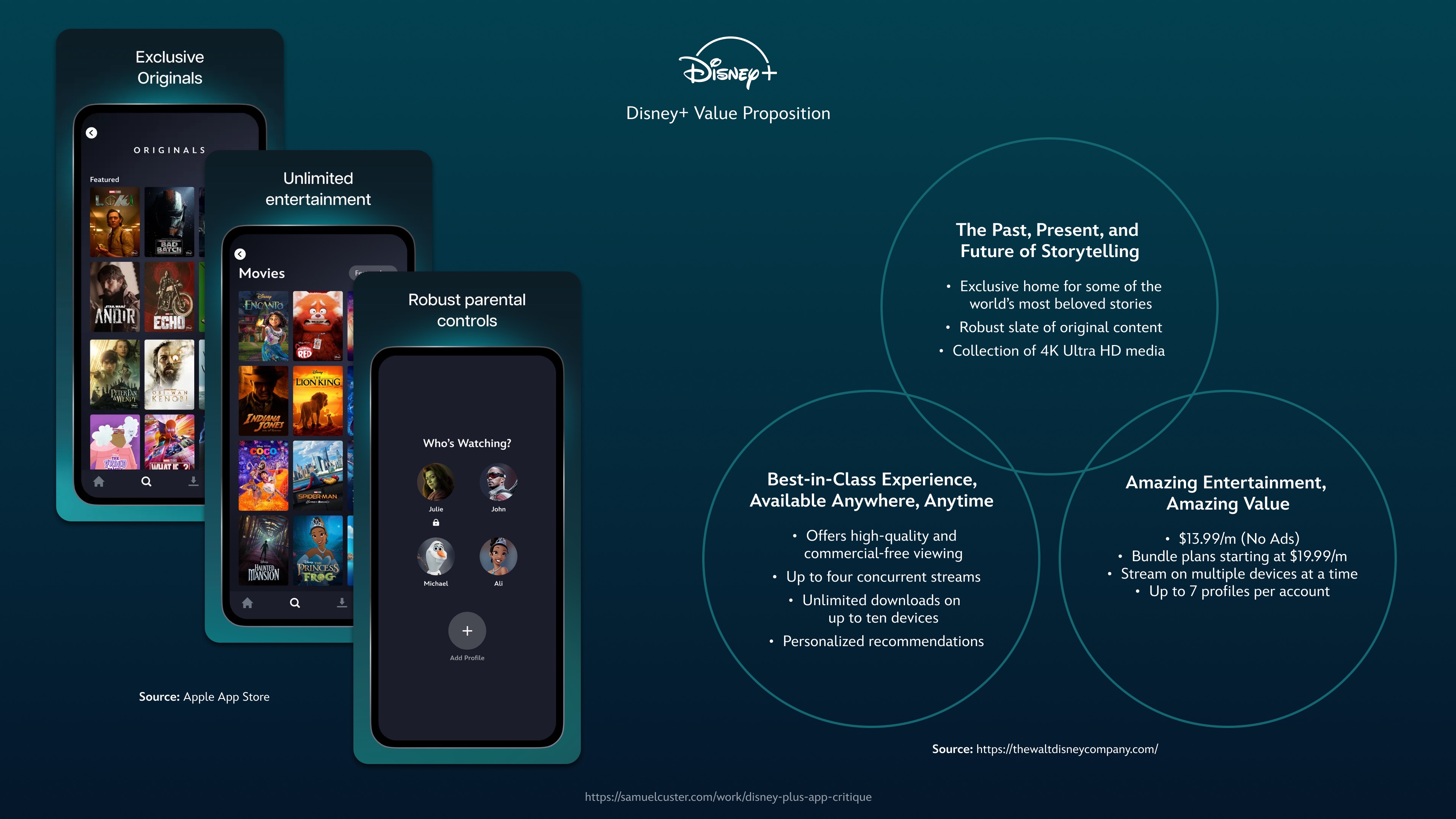 These business goals provide critical context for my app critique, as any design recommendations must not only improve the user experience but also support Disney's efforts to drive subscriber growth and maximize revenue while keeping costs in check. By anchoring my suggestions to these success metrics, I ensure that the design improvements align with both user needs and the company's strategic business objectives.
